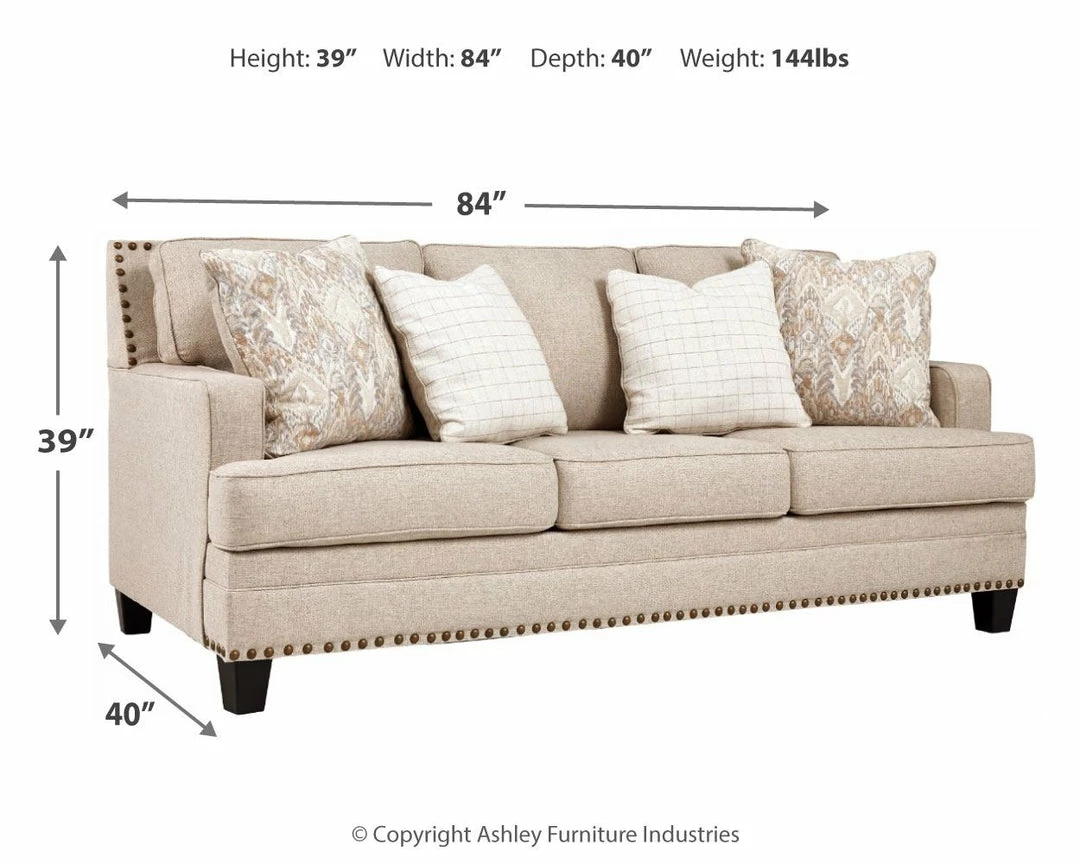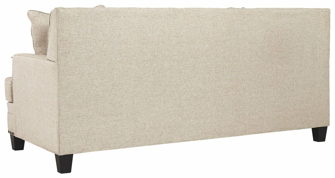 A case of contemporary and classic style influences coming together in a beautiful way, this sofa in beige brings a fresh perspective to modern farmhouse living. Distinctive elements include t-cushions that wrap around setback track arms, nailhead trim and a lovely linen-weave upholstery for an up-to-date feel. Muted hue designer throw pillows master the art of subtlety.