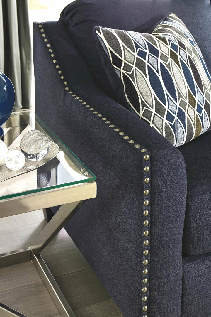 Upholstered in a striking midnight blue fabric with a soft brushed feel, this sofa is undeniably handsome. Sloping arms are beautifully outlined with brushed nickel-tone nailhead. Plush seating sets the scene for toss pillows immersed in a glasswork-inspired pattern design.