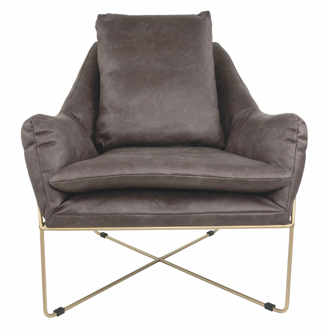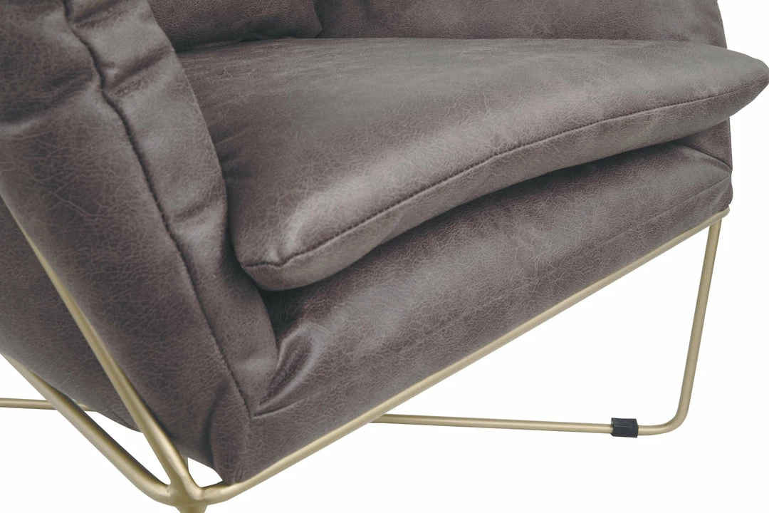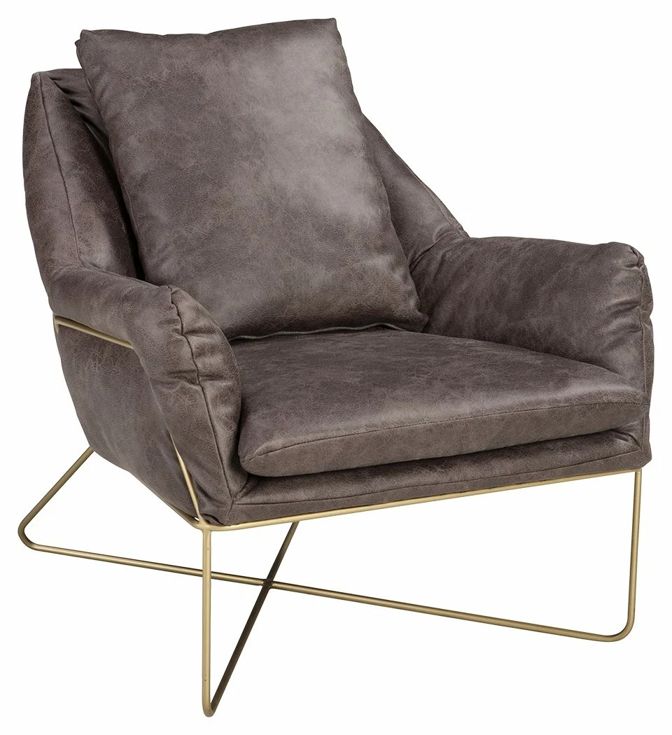 This accent chair is the ultimate statement piece for a cool crash pad. Goldtone metal frame with X base design is so striking. Sumptuously plush, this accent chair’s chic gray faux leather upholstery is luxury made for everyday living.