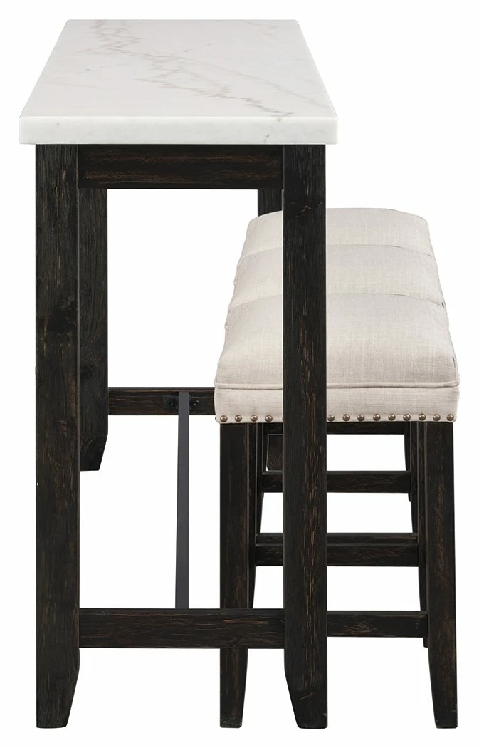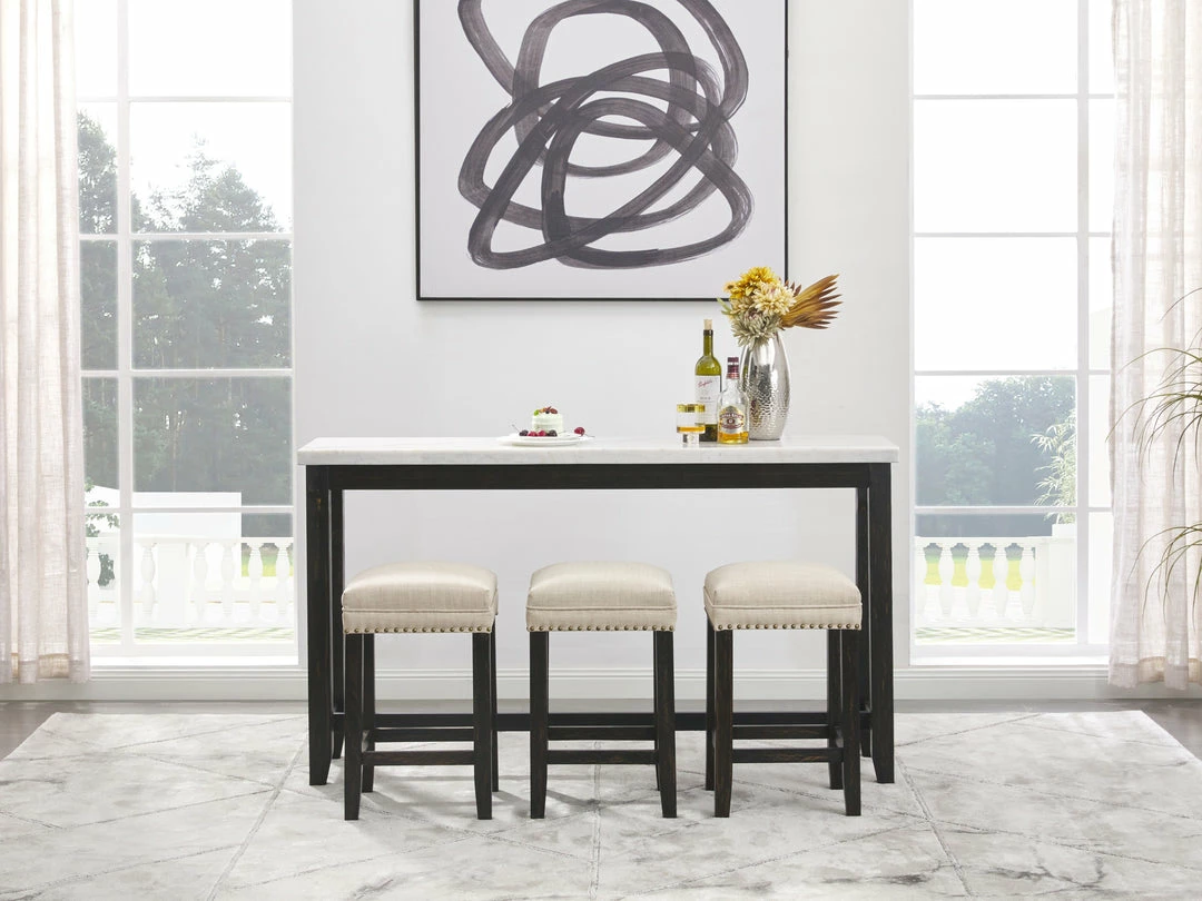 If you love clean, contemporary design crafted for comfortable everyday living, the Anchorville dining room table set is so pleasing to the palette. The counter height table and three comfy stools serve up casually cool character. This set’s ultra-chic, sleek profile and natural marble top feel fresh and contemporary. Neutral seat upholstery with nailhead trim detailing brings added flair. Adding to its beauty, the marble top’s color variations, fissures, mineral deposits and veining are naturally formed and are not defects.