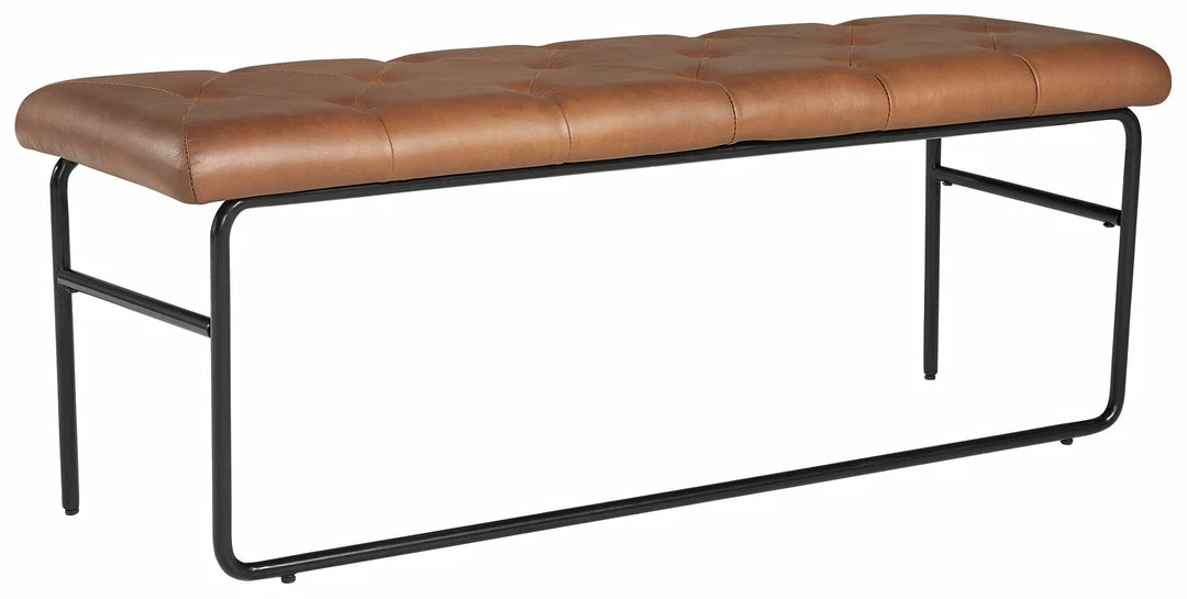Sit on the sidelines in style with this accent bench. Upholstered in distressed leather, this cushion is as handsome as it is comfortable, while black metal legs elevate the aesthetic. Place it in an entryway or at the foot of your bed for a casually contemporary vibe.
