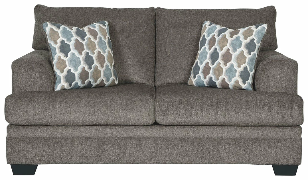 The contemporary Dorsten loveseat has comfort written all over it. From the plush cushions to the textured gray fabric, it’s a total winner for relaxation. The patterned throw pillows in blue, brown and tan complement the richly neutral upholstery.