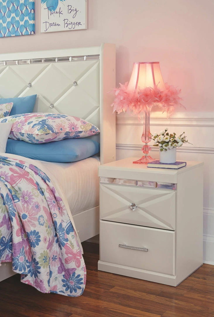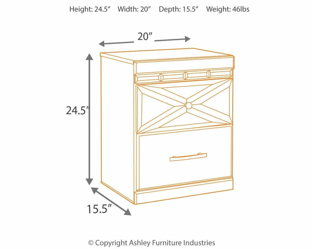 Love sleek and bold contemporary style? Live the dream with this nightstand. Eye-catching details include 3D pressed design with beveled mirror banding and faux crystal accented handles for an added touch of sheen and shine. A clean-lined profile balances the look with sheer simplicity. Subtly placed USB hub is great if you’re one to bring your laptop or tablet to bed.