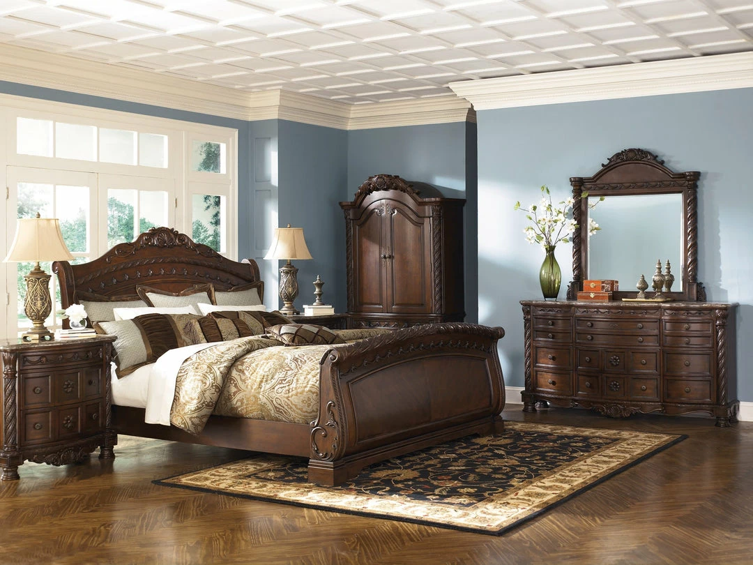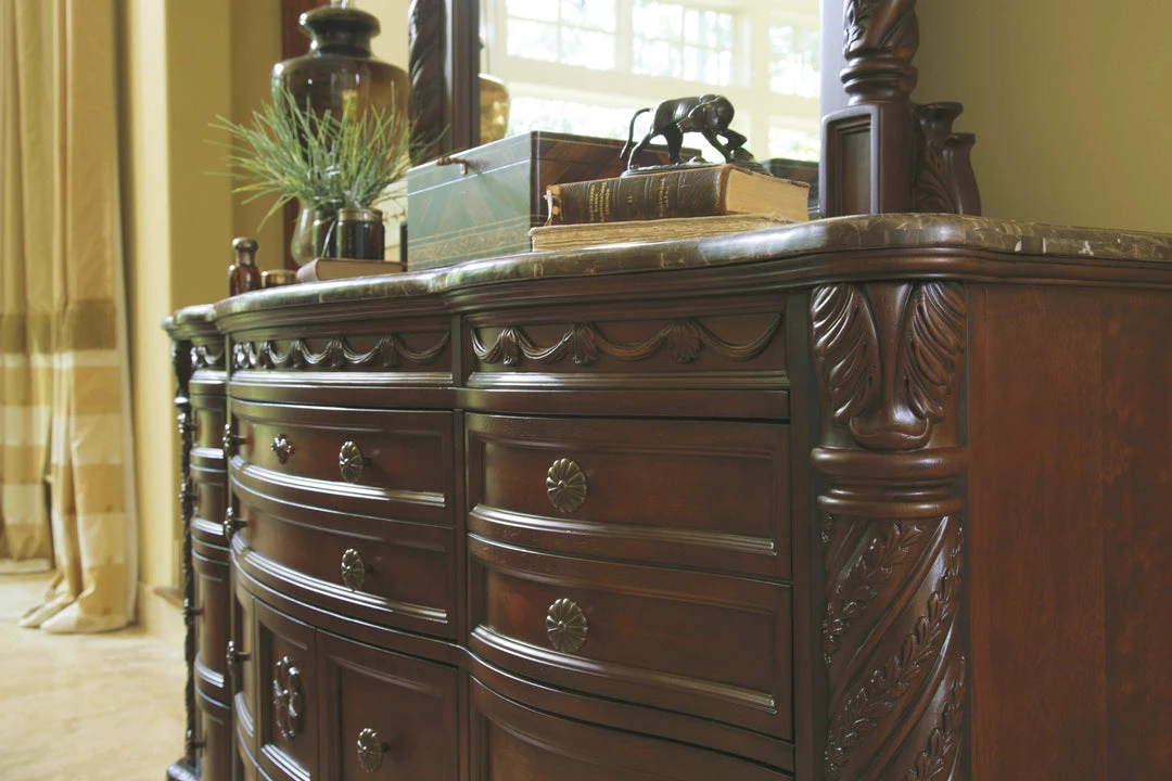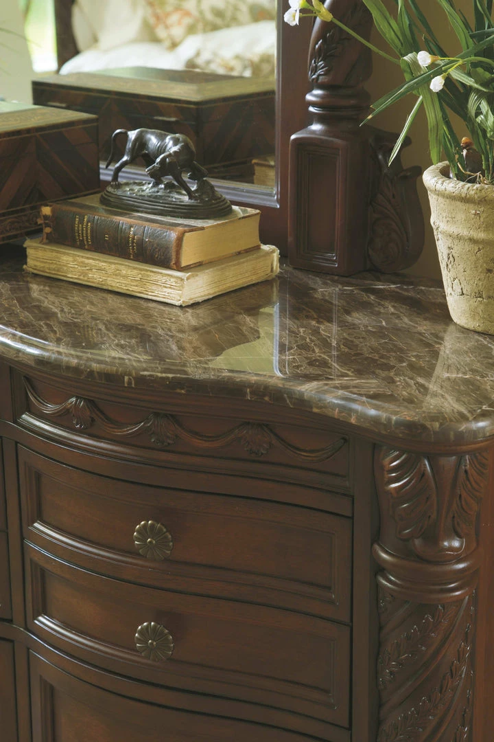 A rich traditional design and exquisite details come together to create the ultimate in the grand style of the “North Shore” bedroom collection. The opulent brown color flows beautifully over the decorative pilasters and ornate detailed appliques to create a rich elegant atmosphere to any home environment. With a serpentine shaped design and inlay stone veneer tops, this furniture collection takes traditional style to the next level. Transform your bedroom with the rich style of the “North Shore” bedroom collection.