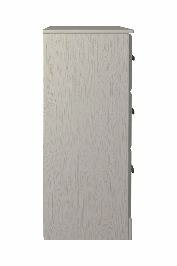With its clean-lined look and modern attitude, this dresser is a fresh style awakening. Crisp, white hue over subtle replicated wood grain easily complements other furniture finishes. Smooth drawer fronts with antiqued pewter-tone handles completes the aesthetic..