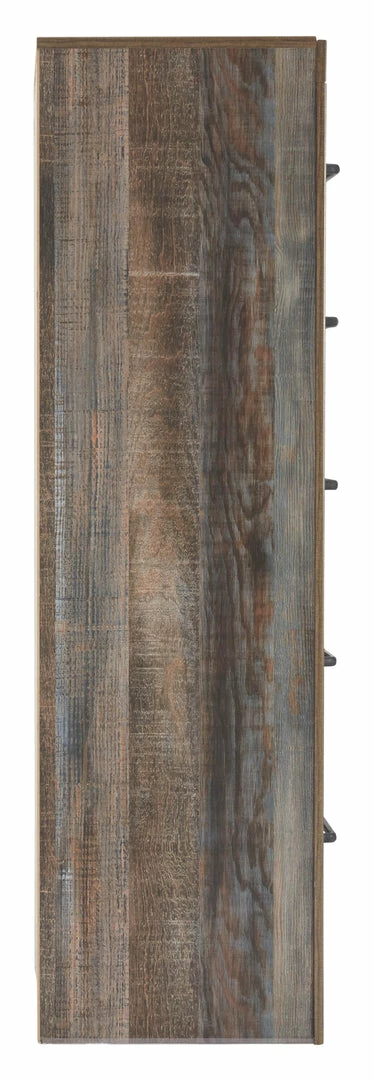 When merged in just the right way, rustic and industrial styles can make one happy marriage. Case in point: this narrow bedroom chest. A refined take on barn board beauty, its complex, replicated wood grain showcases hints of burnt orange and teal tones for a sense of weatherworn authenticity. Elongated drawer pulls elevate the aesthetic.
