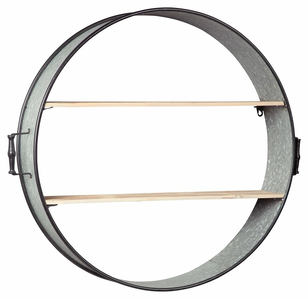 Create extra show-off space by hanging up the this wall shelf. Generously scaled barrel design with wooden shelves puts your decor on display with style. Galvanized metal adds an industrial feel to the look.