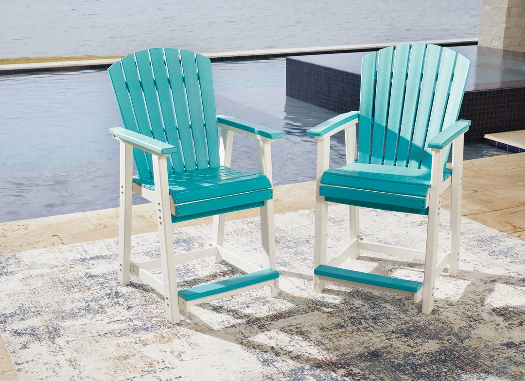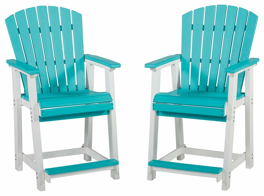 Raise the bar on outdoor living with this bar stool set. Crafted for style and durability, the counter height stool caters with sturdy armrests, an ample footrest, a high shell back and a waterfall wrapped seat for curvaceous comfort. The slatted design easily sheds rainwater. Adding to its appeal: a standout two-tone look that pairs a light turquoise and white for twice the interest.