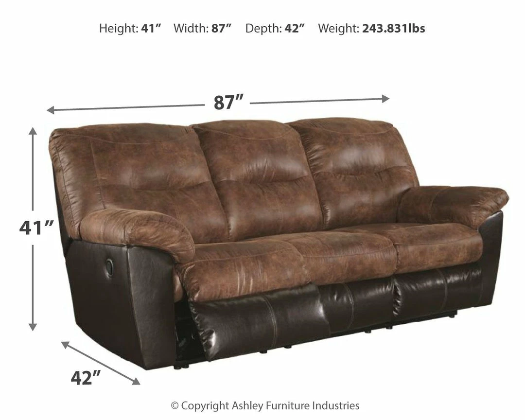 A classic split personality, this overstuffed reclining sofa is a real softie on the inside, but all business on the outside. Rest assured, the soft suede-like material is a perfect complement to the faux leather exterior giving it just the right amount of interest and character. A perfectly paired piece, comfortably priced.