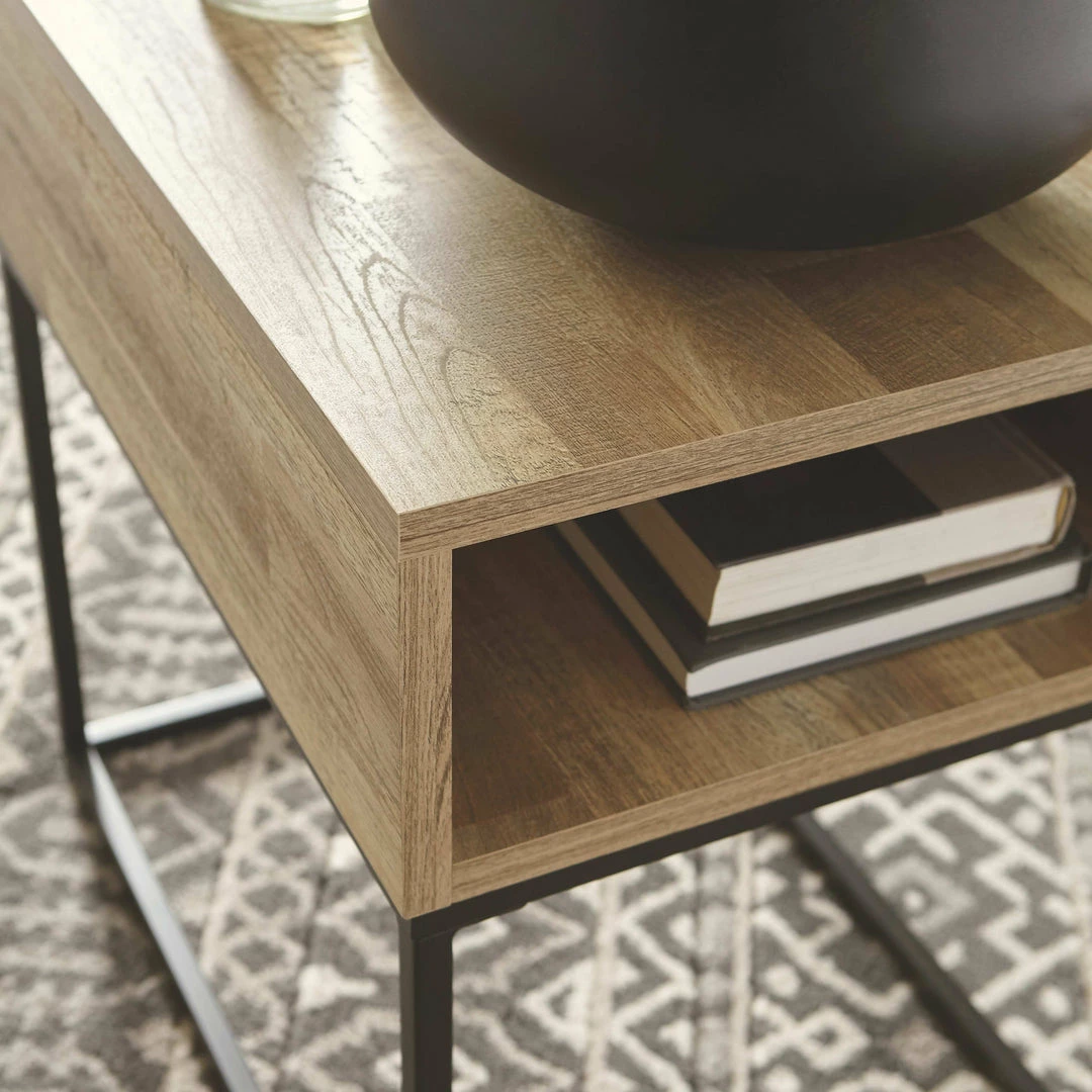 This cool end table offers a fresh take on urban style with a casual design and replicated butcher block finish. The metal base elevates the table and provides open space to add a lightness to your room.