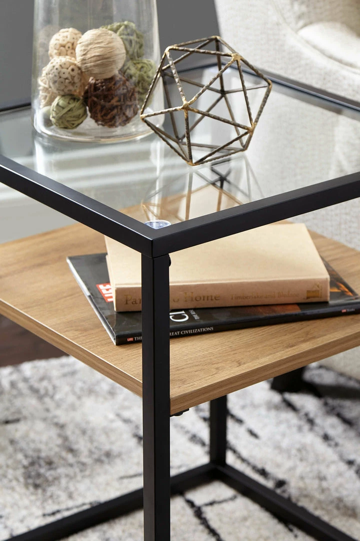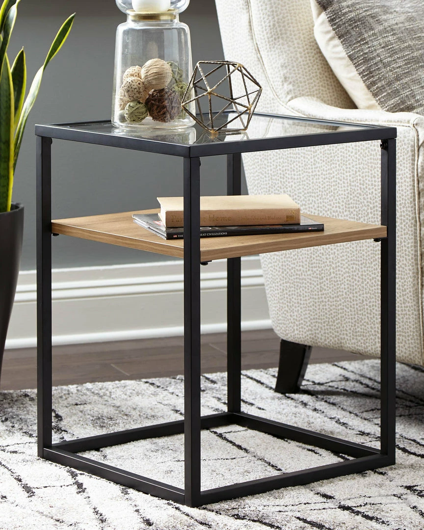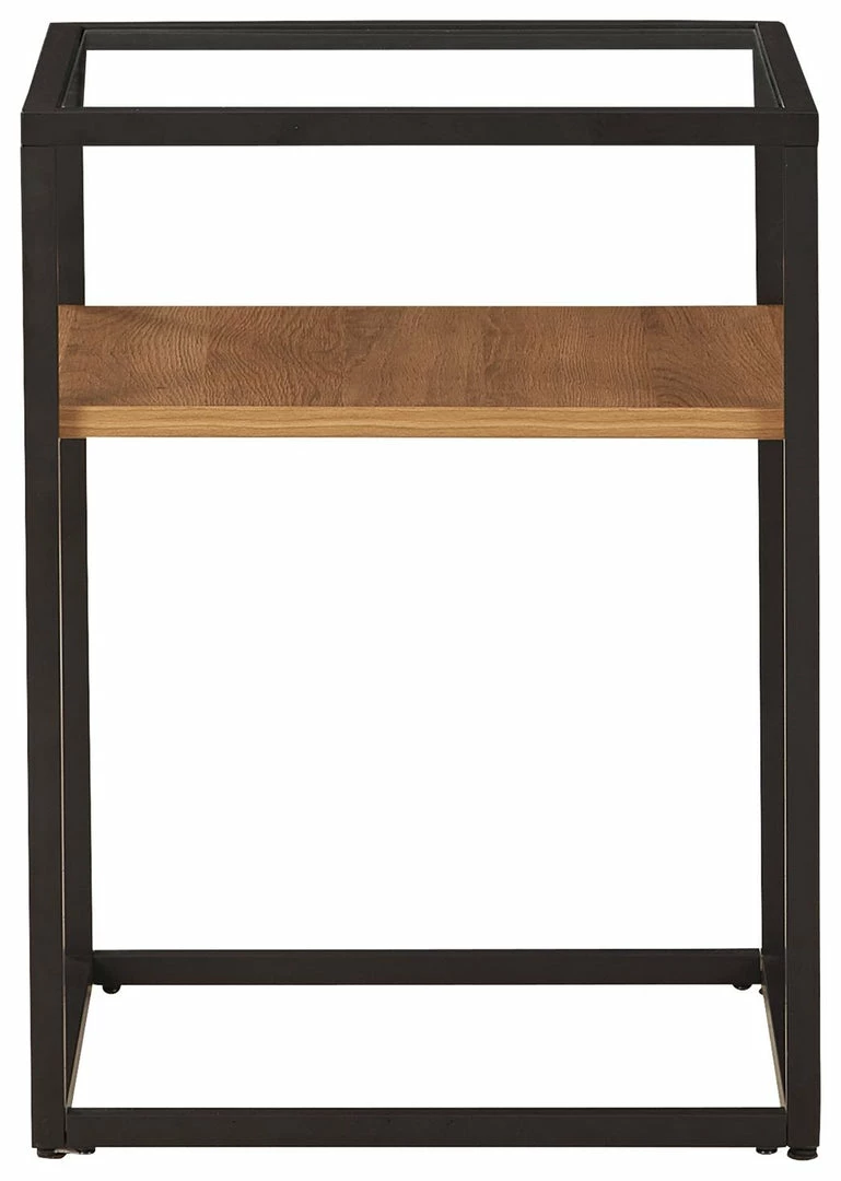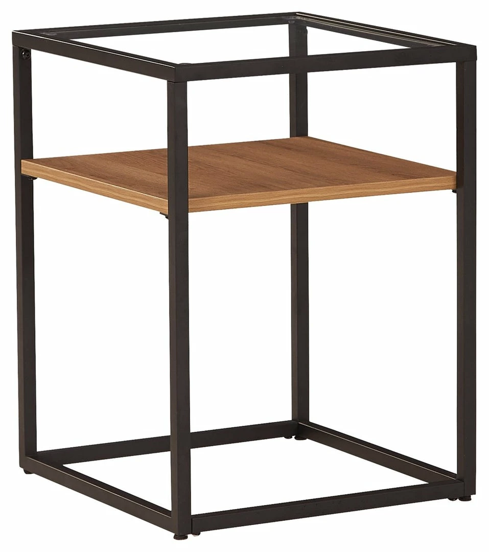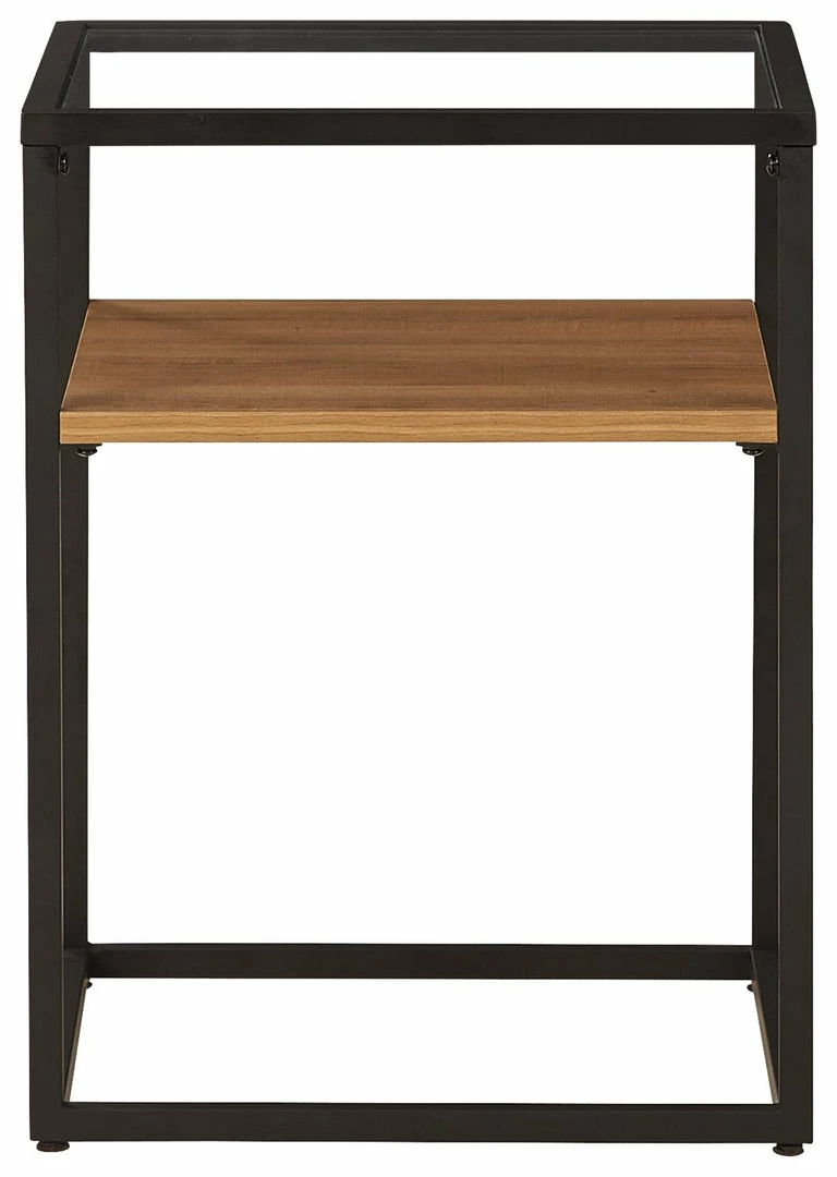 Complete any contemporary room with this accent table. A black finished metal frame creates a strong profile, while the glass top and light brown wood grain effect laminate shelf make a dynamic decorative piece with function.