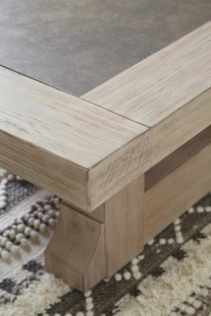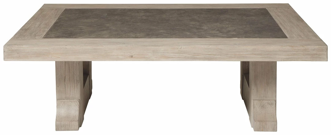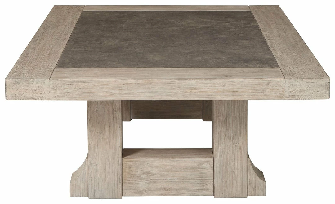 A striking example of rustic refinement, this coffee table is generously scaled to accommodate your entertainment needs with ease. Made with pine wood and veneer beautified with a complex bisque finish, this designer coffee table includes a top with melamine inset for mixed-media interest.