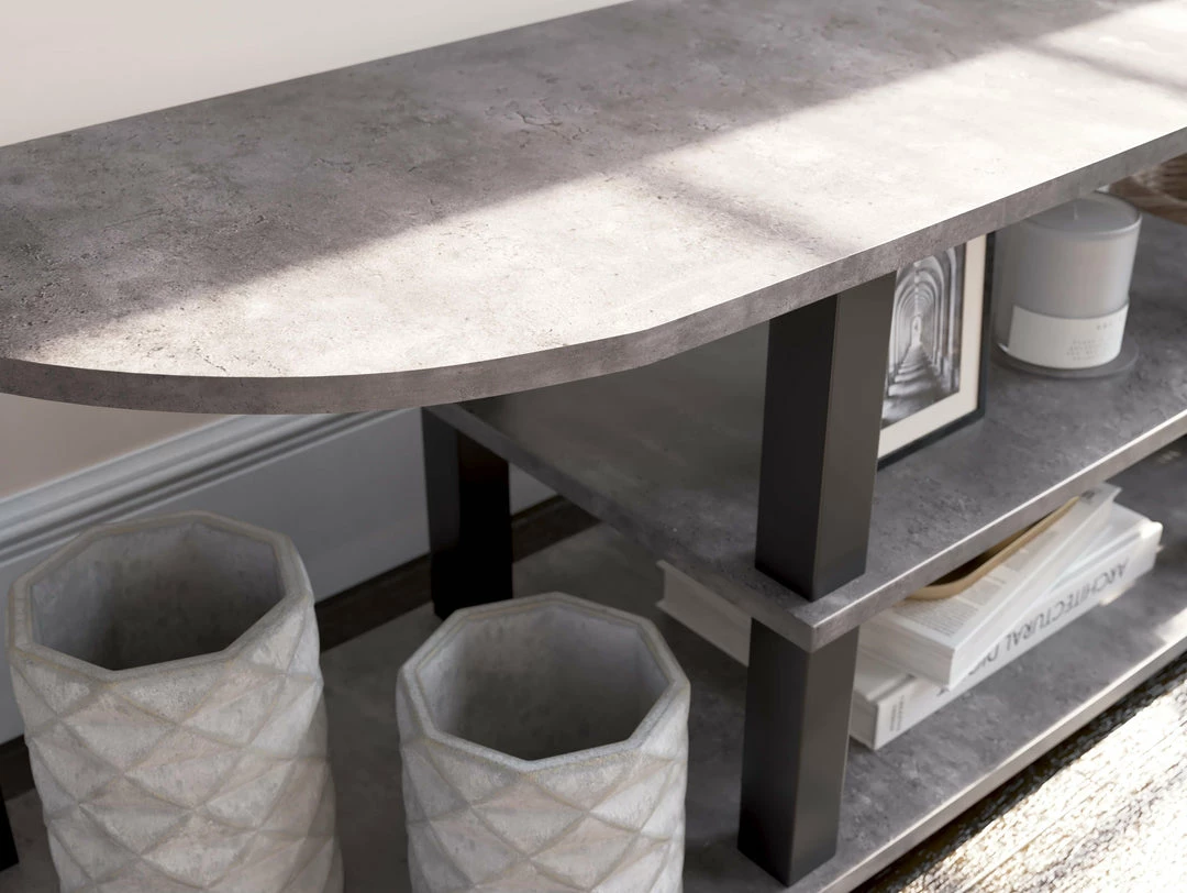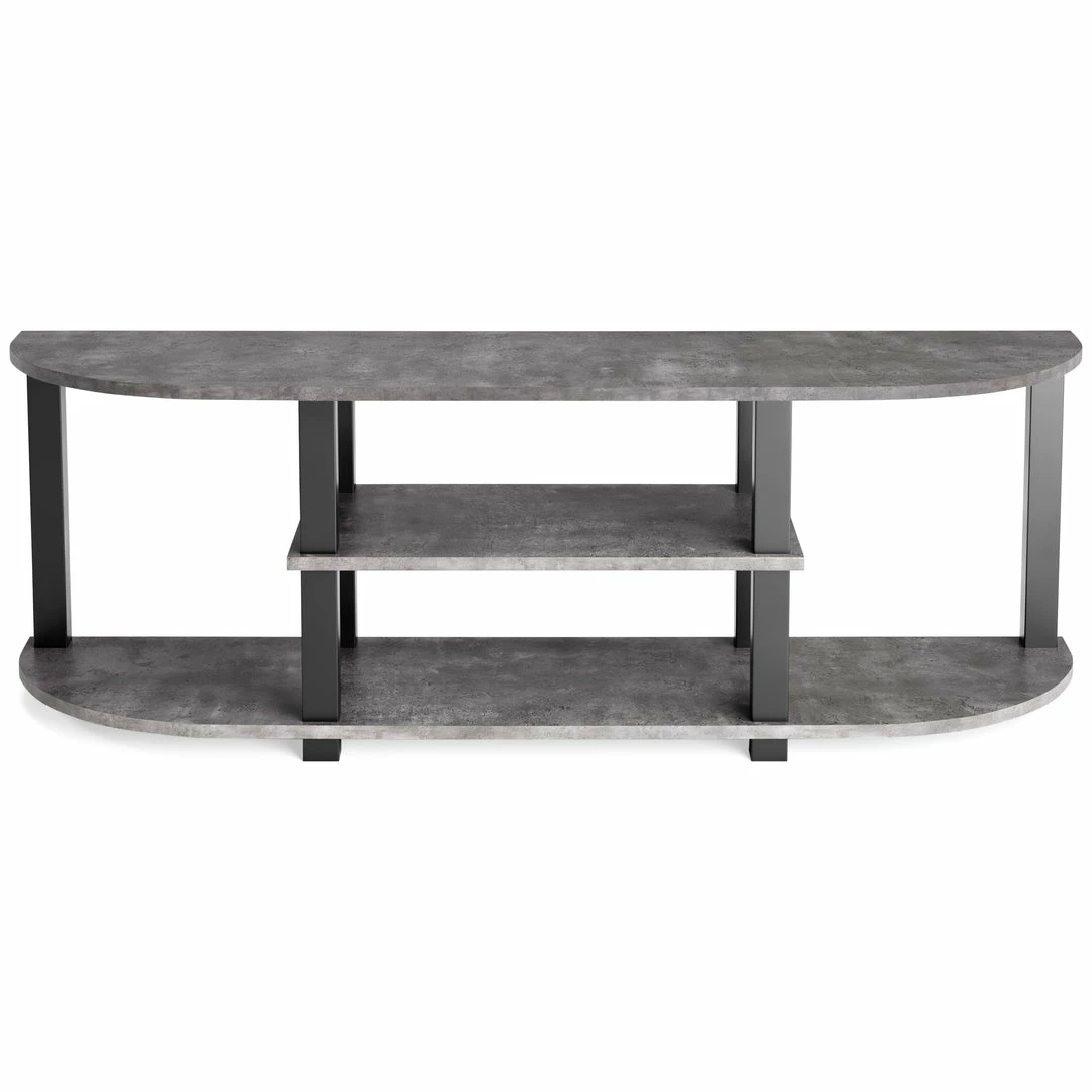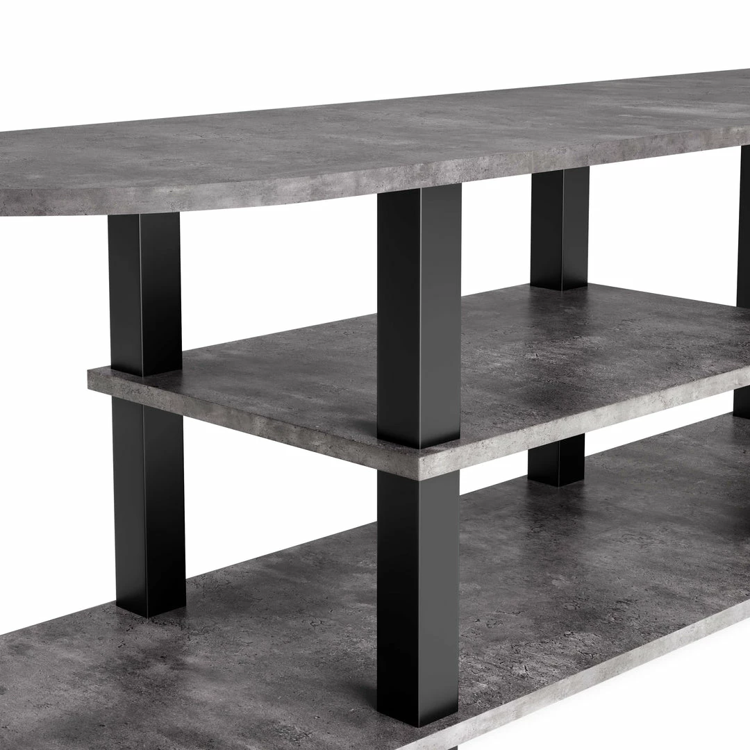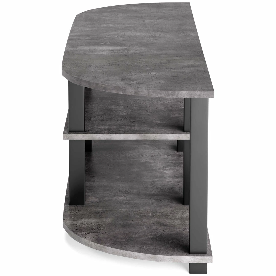 Love urban contemporary styling? Then you’re sure to find this TV stand right in tune with your design sensibility. Its distinctive two-tone finish combines a faux cement decorative laminate with contrasting satin black for striking results. This modern TV stand wows with a cool, curvaceous profile and compact footprint that’s especially welcome in smaller spaces. And what a great option for your gaming setup.