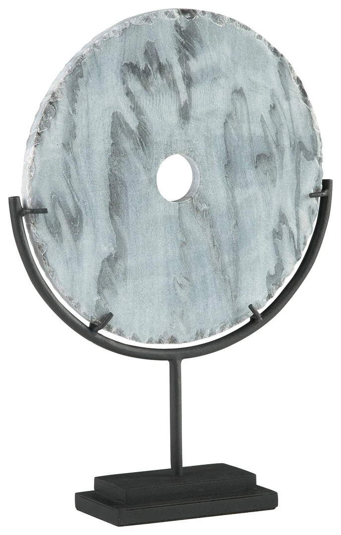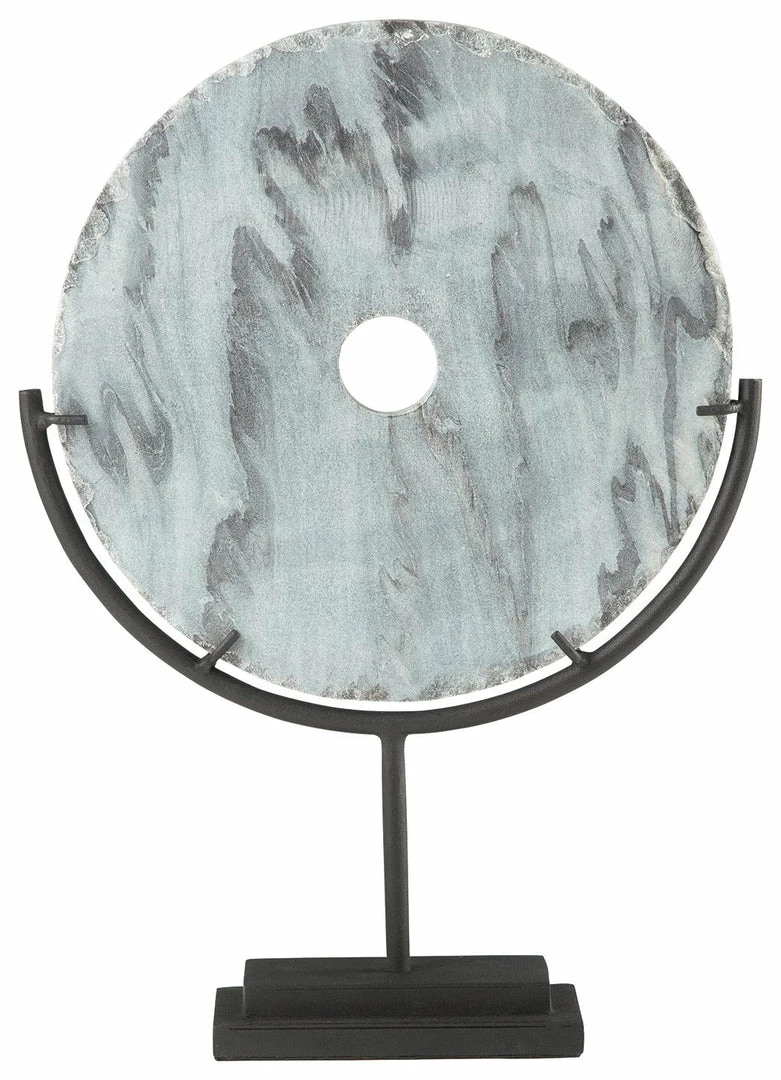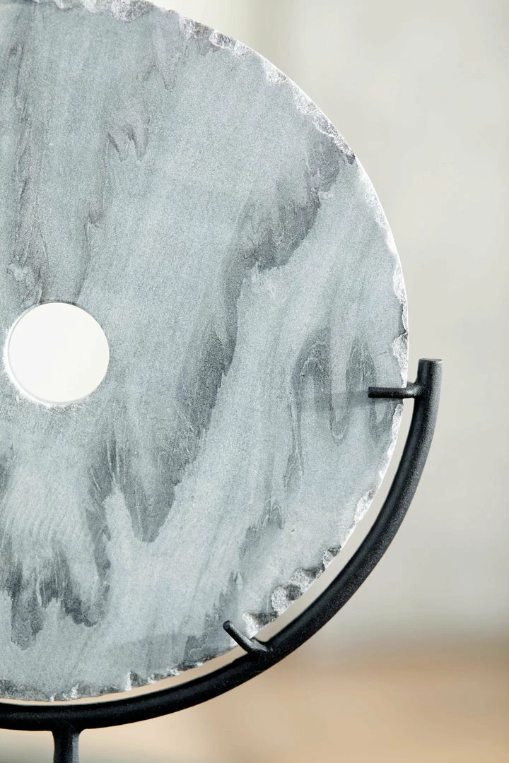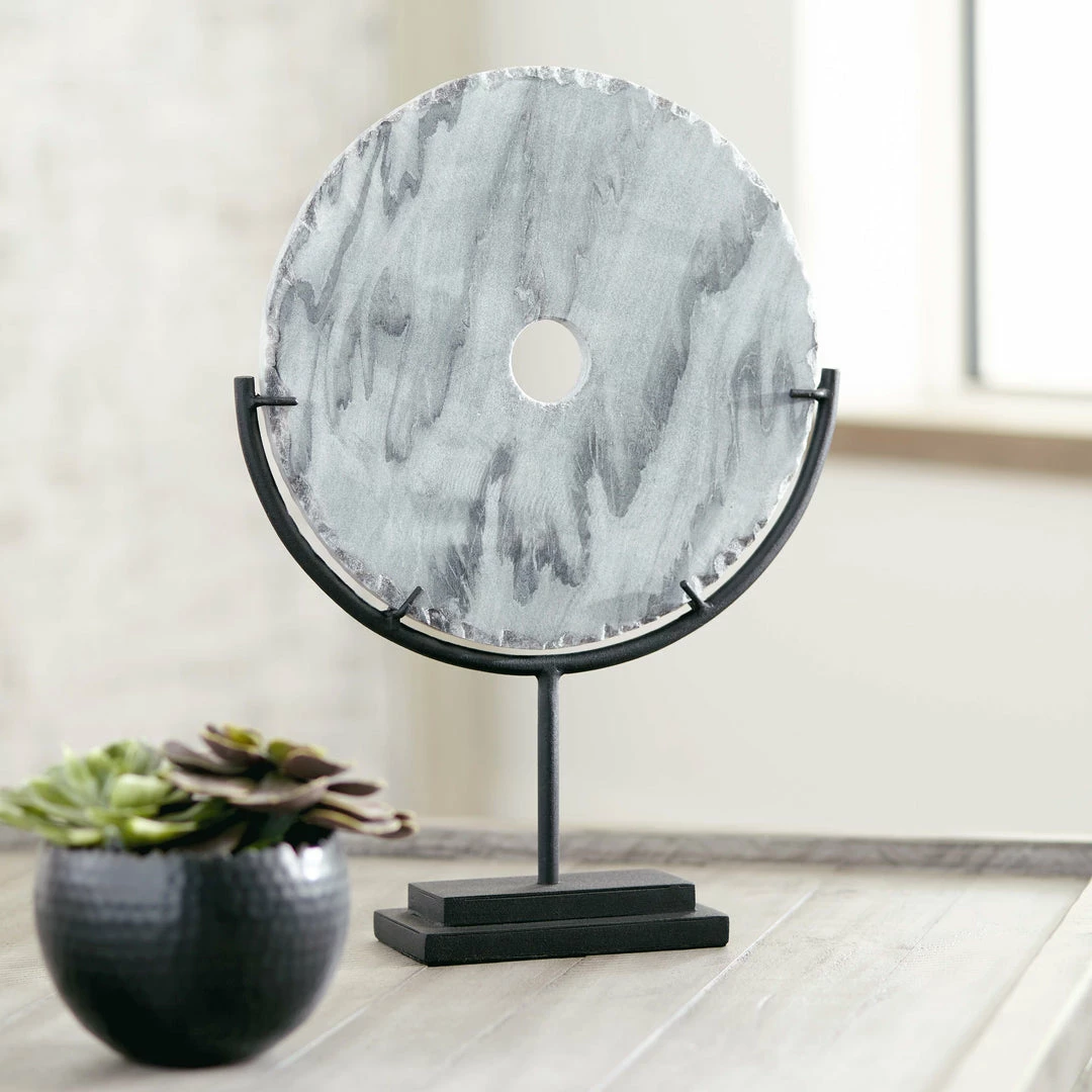 An upscale twist. Like something you’d see in a trendy contemporary art gallery, this gray marble disc sculpture on a black metal stand is as elegant as it is eye-catching. What an especially striking entryway piece.