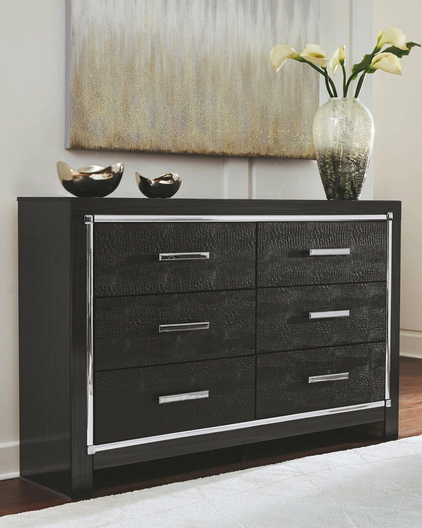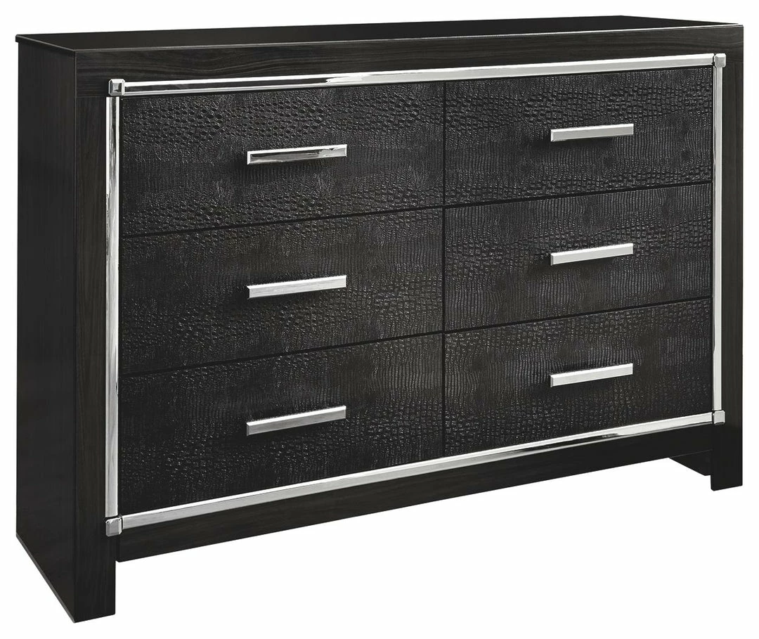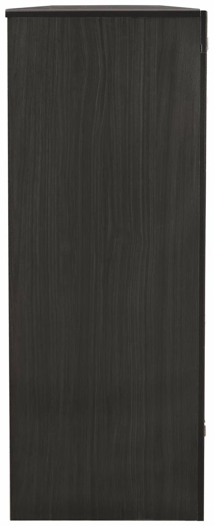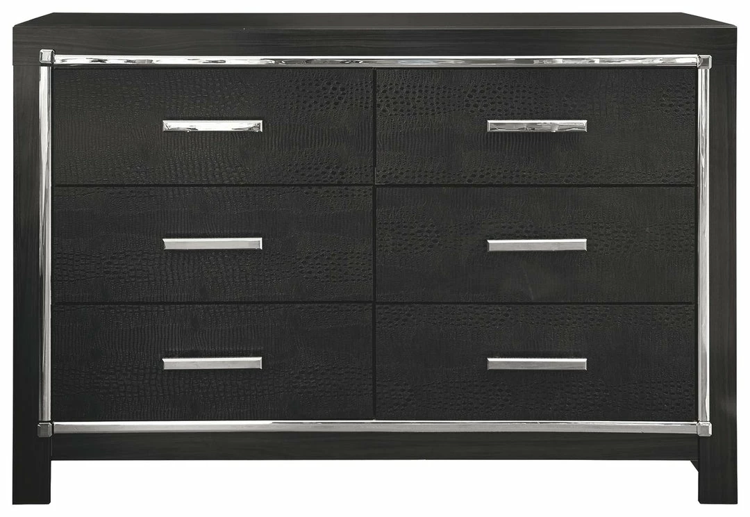 Textured faux black gator finish on case fronts, with replicated Walnut wood grain sides. Cases and bed are accented with faceted chrome details. Large scaled chrome handle with faceted details. Headboards are accented with LED lighting and include a remote for color and brightness options. Included remote holder discreetly keeps light remote accessible. Headboards are accented with faux crystal tufted black upholstery. Side roller glides for smooth operating drawers. Drawer interiors are lined with a faux linen laminate for a clean finished look. Both king and queen panel beds have a panel footboard (54,56) and storage footboard option (54S, 56S). Queen (57) and king (58) headboards can attach to a bolt-on metal bed B100-31 or B100-66 respectively. Both USB and Qi wireless charging options are provided with the night stand. Safety is a top priority, clothing storage units are designed to meet the most current standard for stability, ASTM F 2057 (ASTM International). Drawers extend out to accommodate maximum access to drawer interior while maintaining safety.