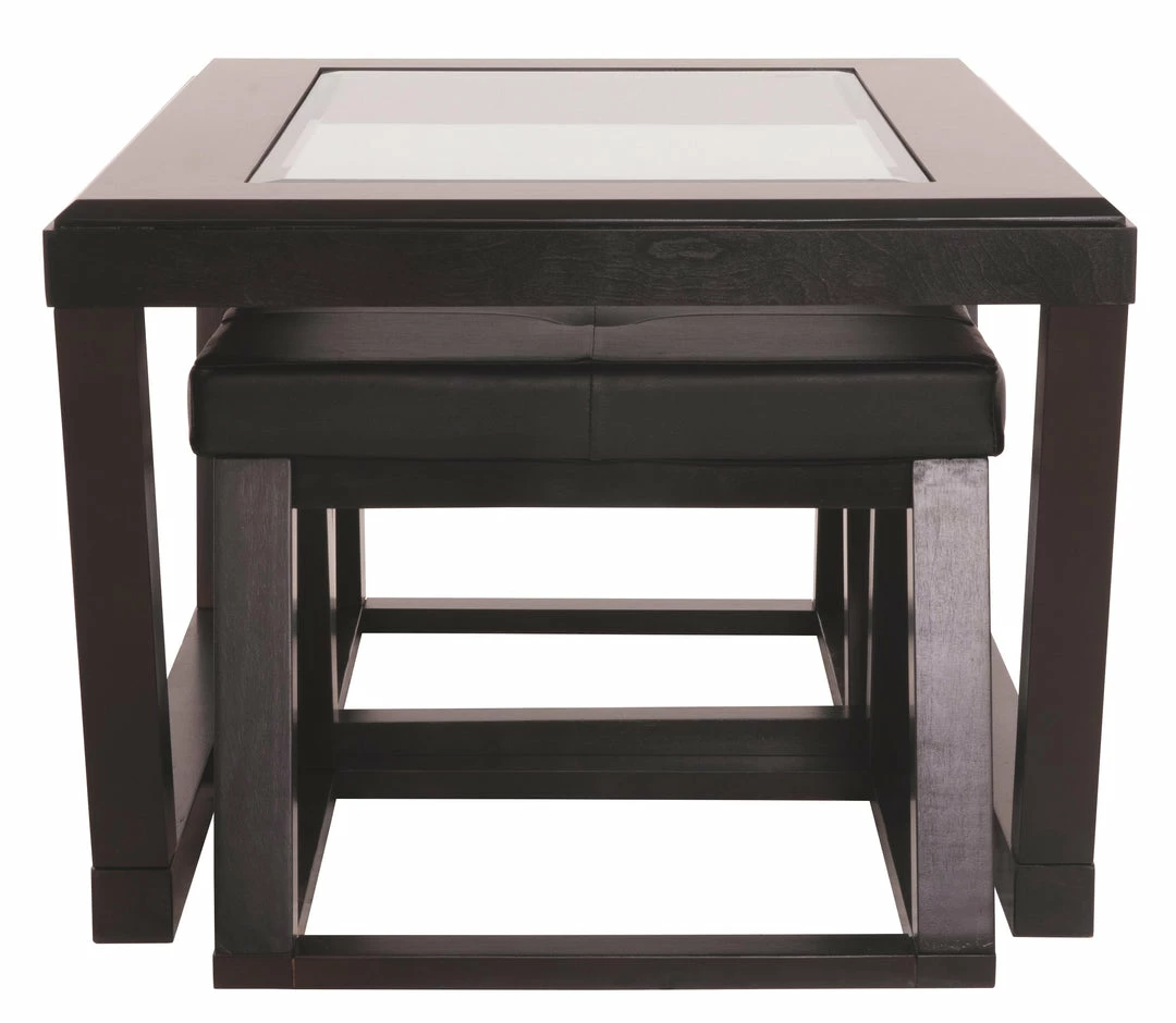 This coffee table with stools sits beautifully with those looking for multi-functionality from their contemporary furnishings. Two nesting ottomans, upholstered in faux leather, provide handy informal seating and a comfortable place to kick up your heels.