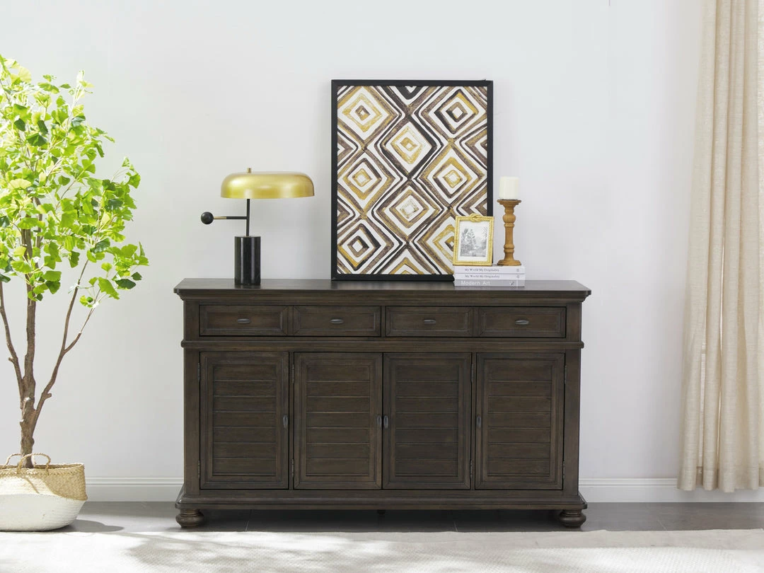 The perfect complement to any dining room or living room, this dining server is fashionably functional. Designed with multi-use practicality in mind, it serves equally well as a living room console. Along with three spacious cabinets and hidden shelf space, two top drawers with full extension glides take storage to the max. Cheers to the wine rack, as well.