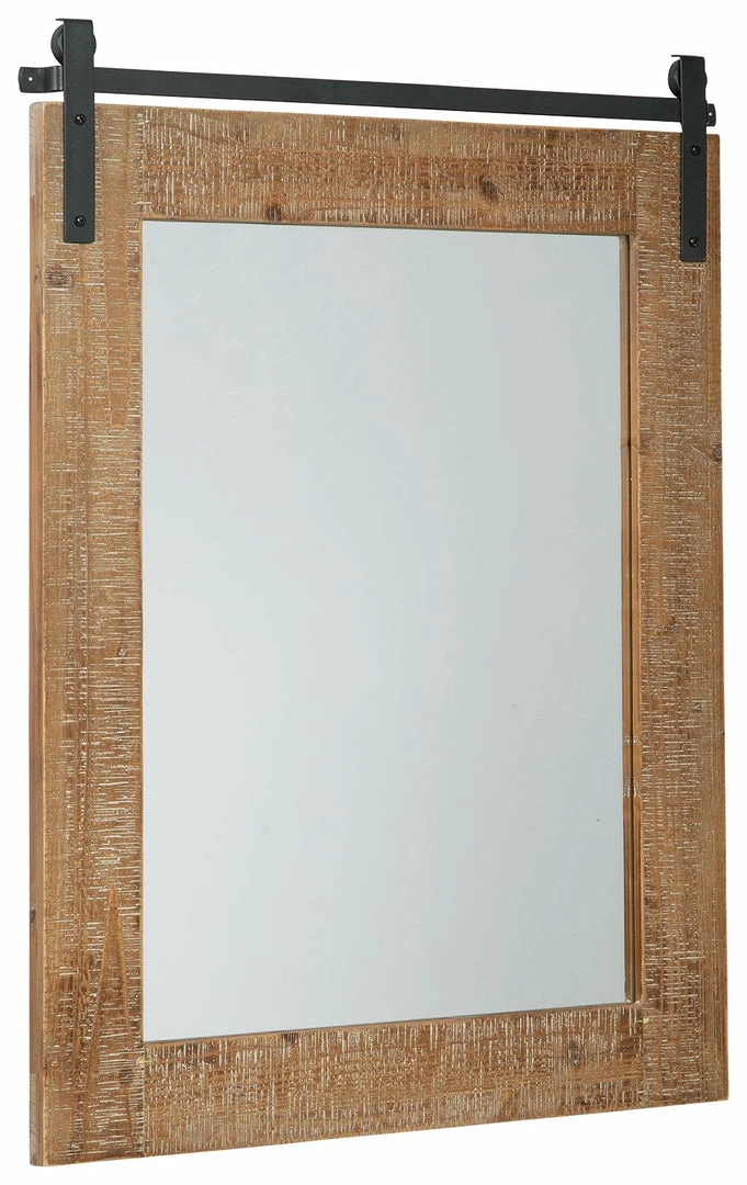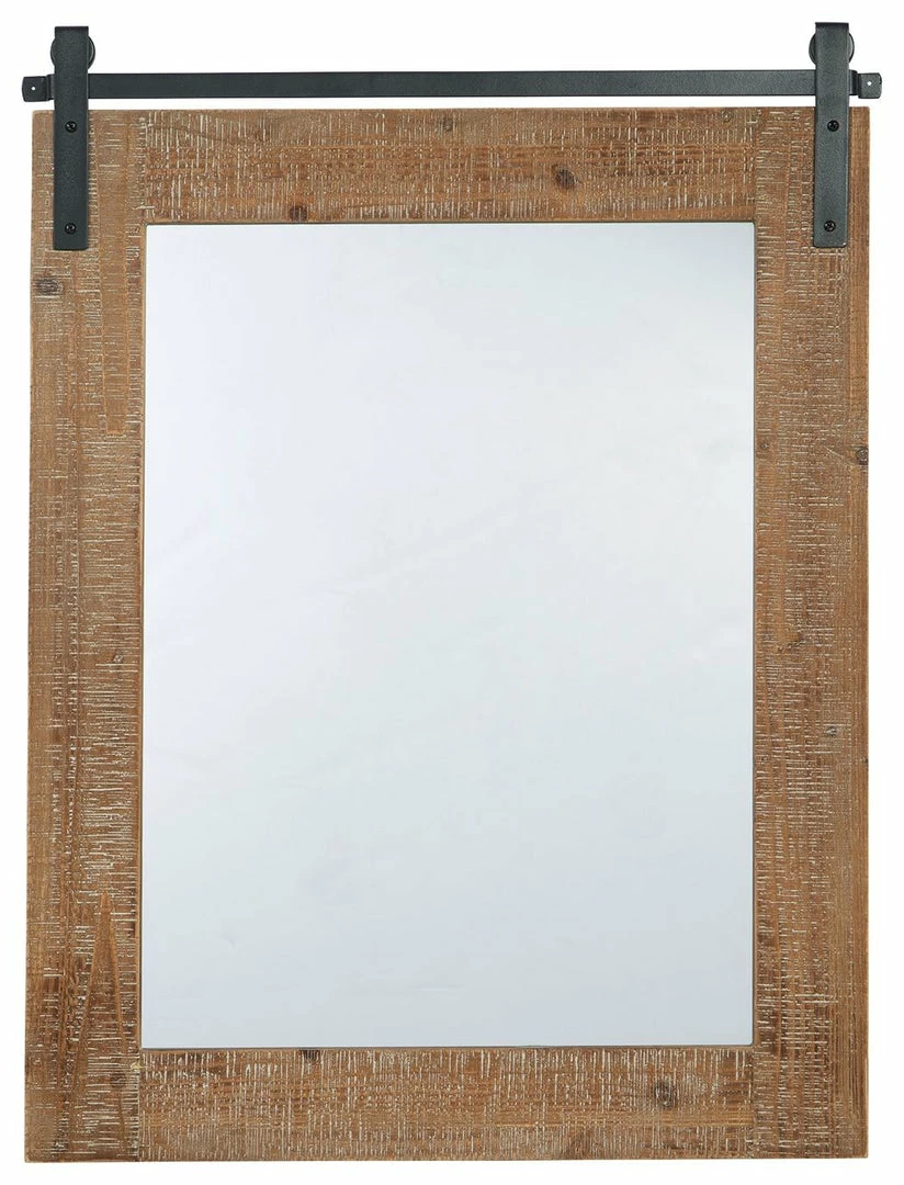 Getting the casual yet complete look you love is a breeze with this accent mirror. With its antiqued brown finished and rough sawn wood, this accent mirror features a black finished metal faux barn door track adding a touch of warmth to any space.