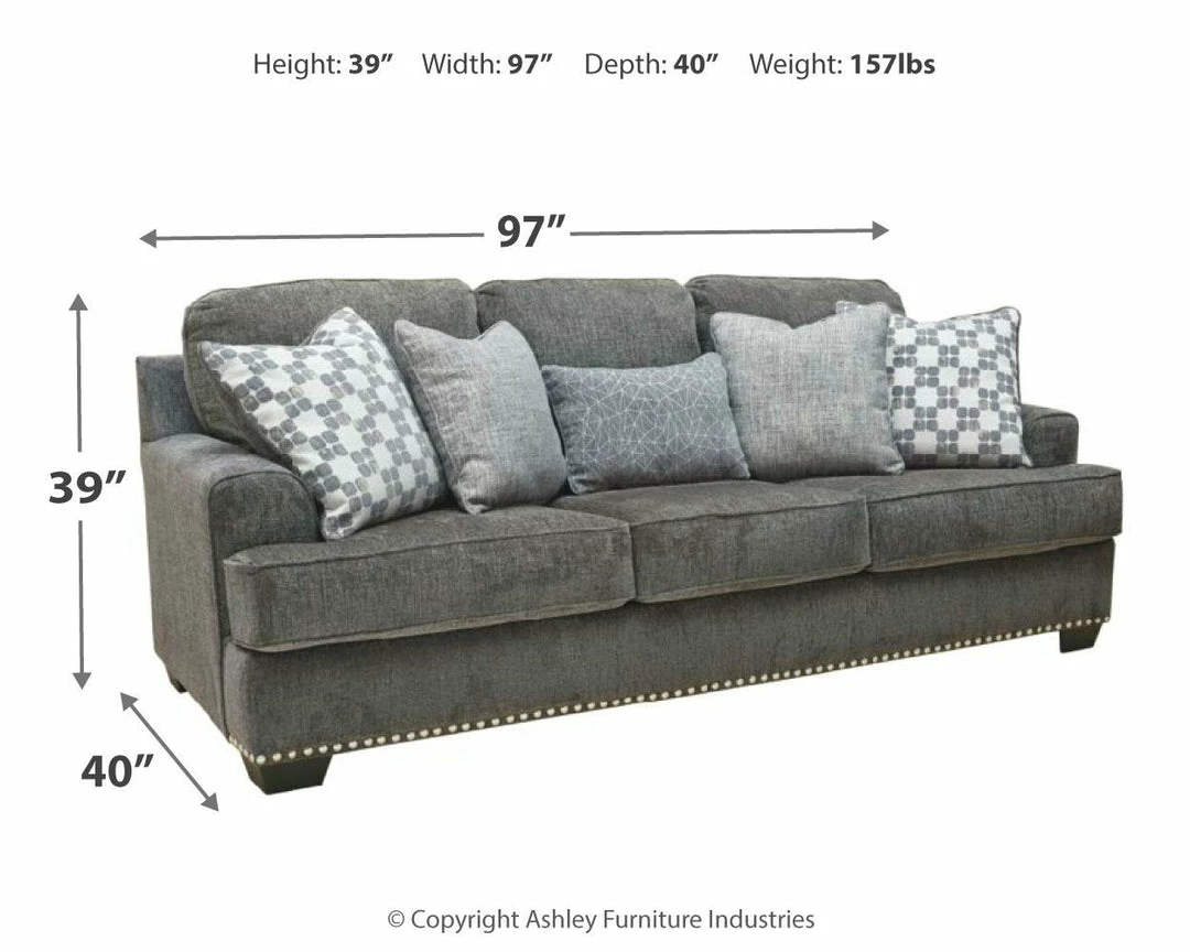 Don’t you love when furniture feels as good as it looks? There’s no doubt this sofa makes a trendsetting first impression. Textural chenille fabric elevates the look of your room with its handsome gray hue. Pewter-tone nailhead trim brings an element of shine. Prop up the fashionable throw pillows or curl up with them as you get comfortable. Oversized scale with deep seating will give you plenty of those “I fell asleep on the sofa” moments.