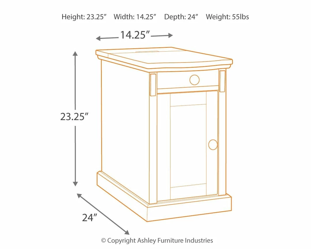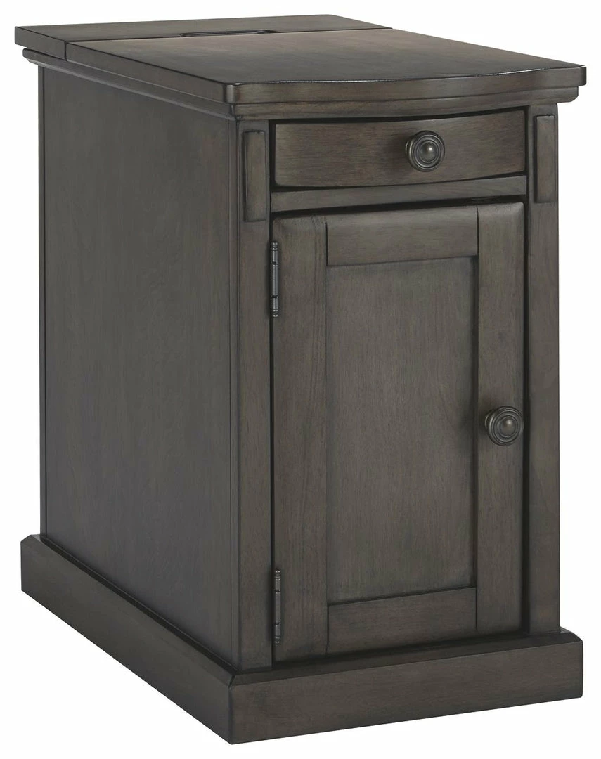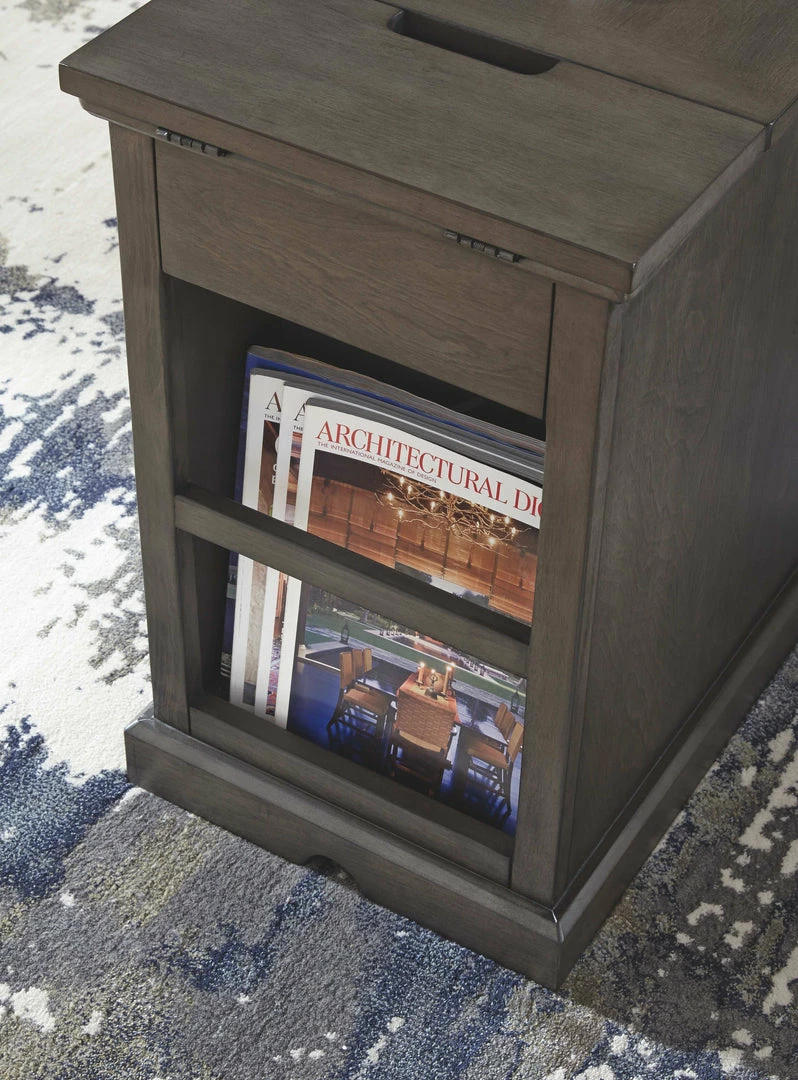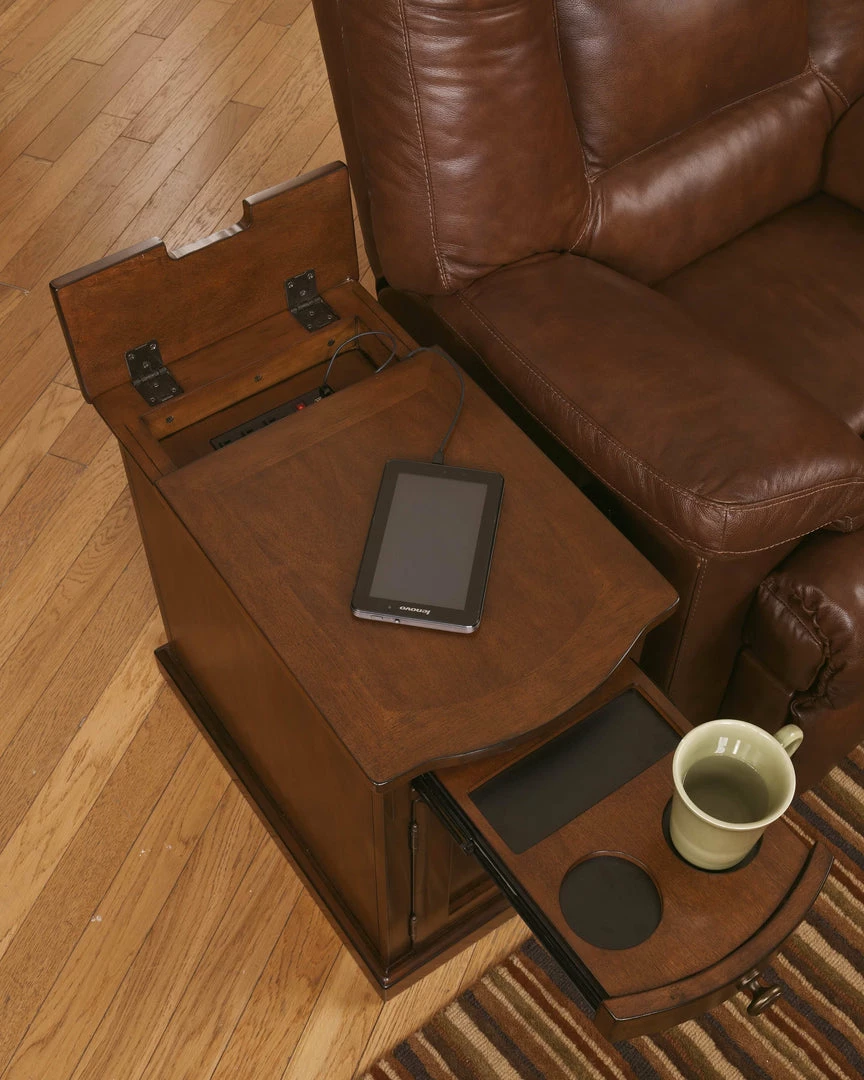 So much form and function in a beautifully compact piece of furniture. Richly crafted with a warm and rustic style, this chairside end table puts it all within reach, including a flip-up top panel revealing a power portโperfect for keeping your phone or laptop charged. Hidden twin cup holders and interior shelved storage are also a welcome surprise.