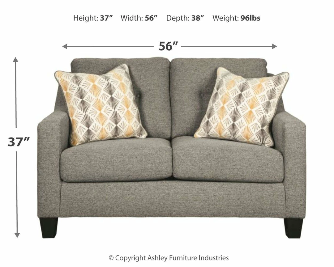 Cool and contemporary with a touch of mid-century flair, this graphite gray loveseat is a sight for sore eyes after a long, hard day. The loveseatโs box cushion styling is beautified with button-tufted accents and sloped track arms that go with the flow. Inspired by tailored menswear, the gorgeous gray upholstery with chenille-feel softness is complemented with vibrant print pillows in butterscotch and gray.