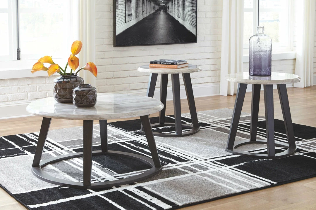 This round coffee table set makes upping your style as easy as 1-2-3. Faux Carrara marble tabletops bring an upscale look to the scene. Finished in a sleek matte black, the sculptural bases with canted legs are cool from every angle.