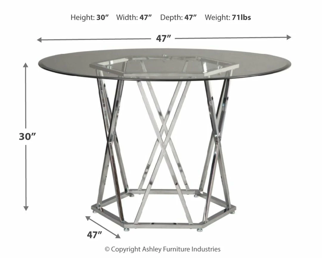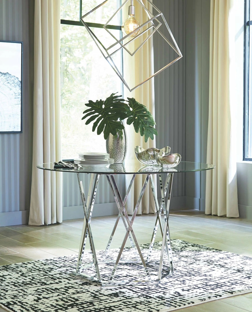 Wowing with an open and airy but sturdy profile, this round dining room table is sure to whet your appetite for ultra-contemporary style. Sporting a chrome-tone finish for a high-sheen effect, the hexagonal metal base is striking from every angle. Clear glass top rounds out the look with sheer simplicity.