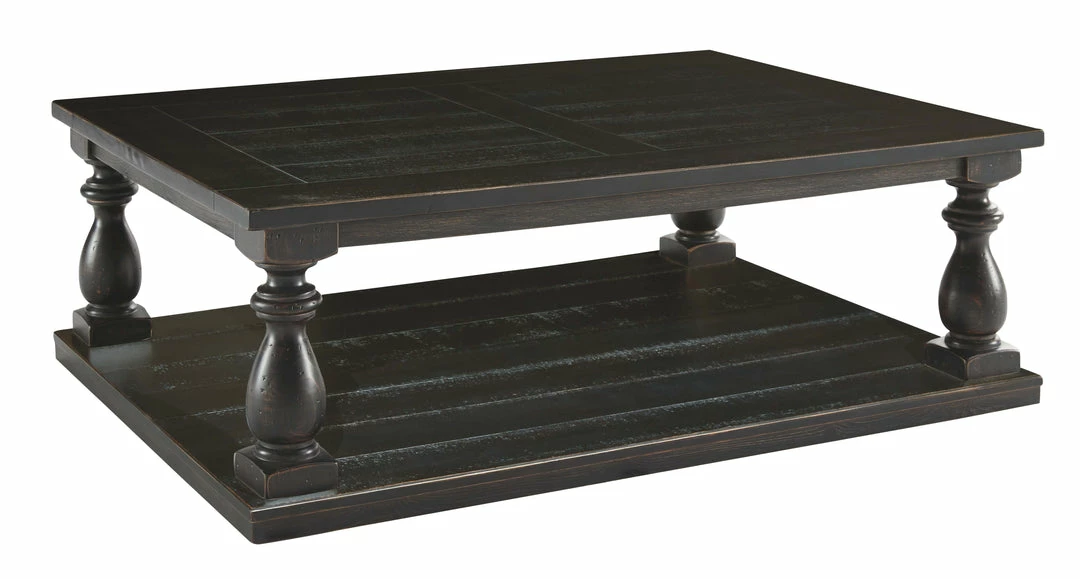 This generously scaled coffee table in black has a dramatic presence—exactly what an eclectically styled room needs. Solid wood planks and thick veneer merge seamlessly together for a hearty helping of style. Handsomely turned legs connect to a lower shelf flush with the floor. A rustic wirebrush technique gives this stunning rectangular coffee table in black with show-through contrasting just enough of a weathered sensibility.