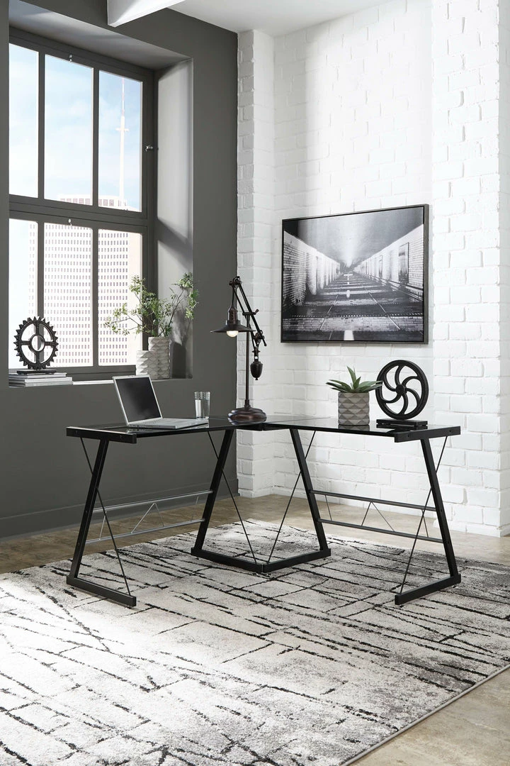 Bring a midtown feel to your office with this L-desk. The three-piece modular desk can easily transform a small space or spare bedroom into a stylish work-from-home environment. With a satin black powder coated finish and contrasting chrome-tone stretchers, this desk makes a bold statement while providing ample work space.