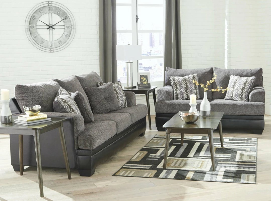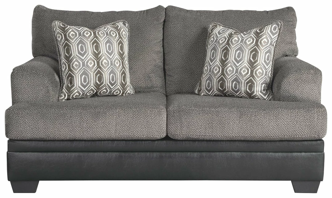 Comfort is inevitable with this loveseat. Handsome profile is teeming with chenille softness. Smoky gray textured cushions meet black faux leather for a quality look. Throw pillows with a trendsetting geometric pattern season this sofa with extra style flavor.