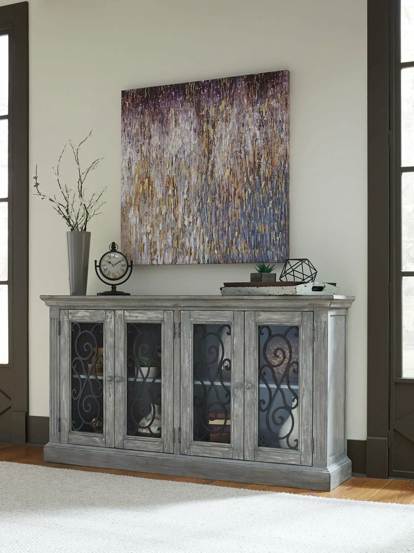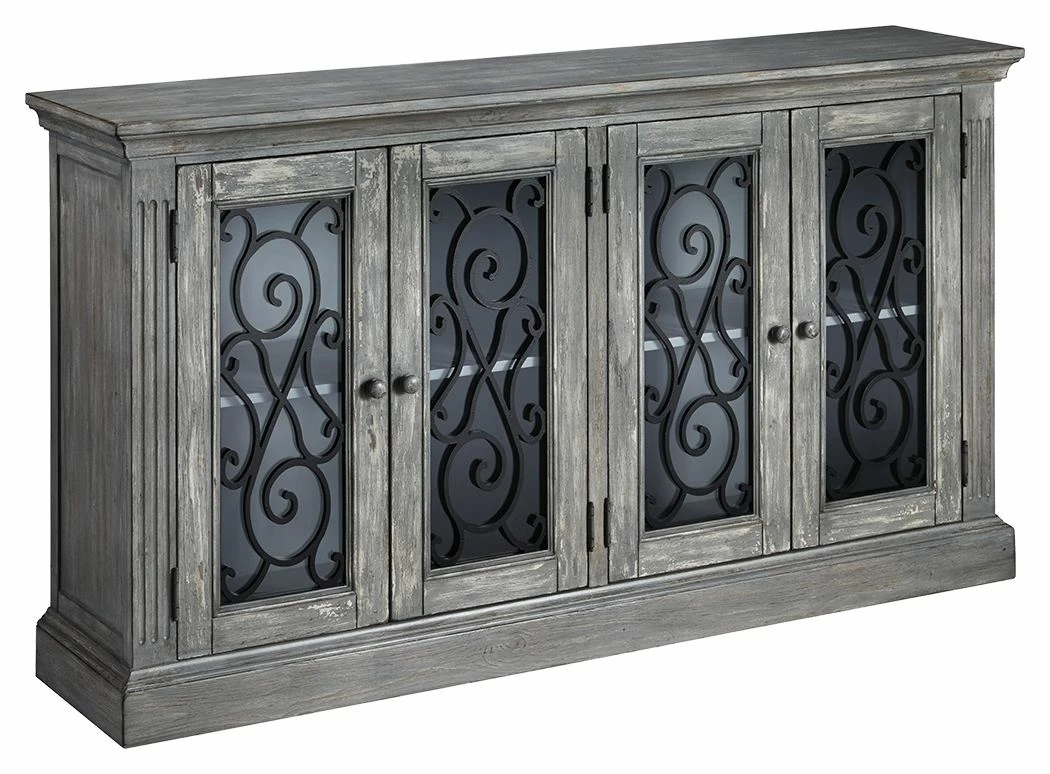 Rustic refinement is brilliantly on display in this coveted cabinet. Whether gracing the dining room, living room, office or entry, itโs an eclectic piece loaded with versatility and charm. Ornately scrolled grillwork on the glass-front doors adds a touch of romance. Adjustable shelving enhances the form and function.