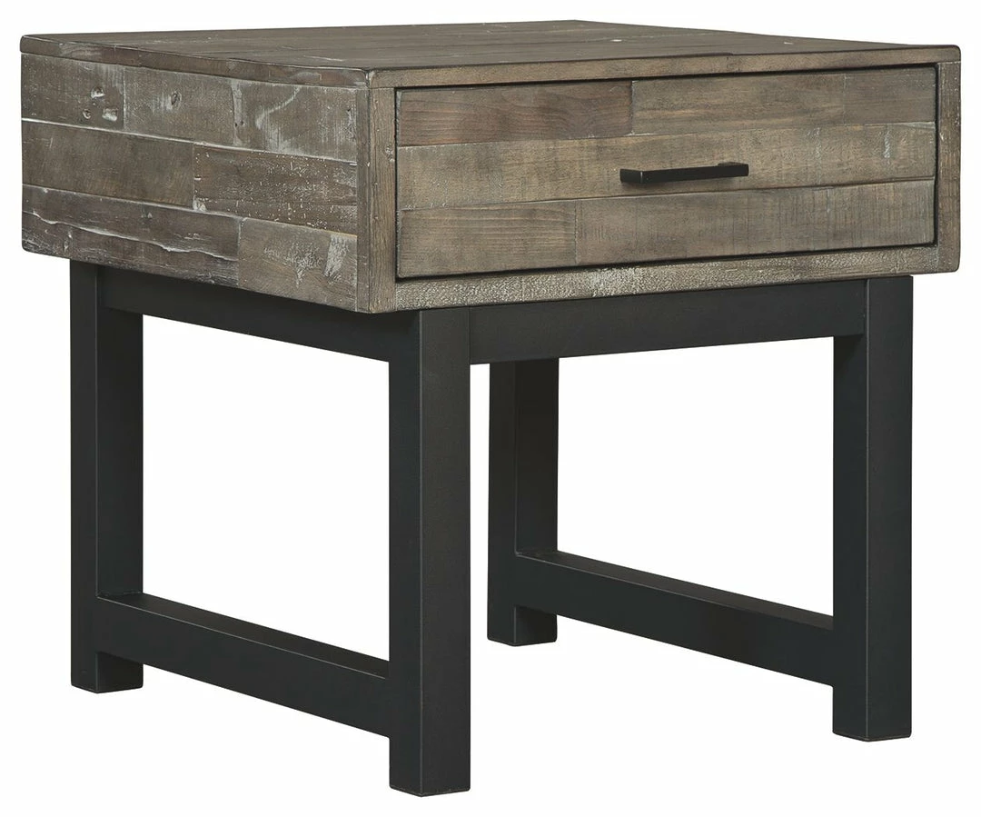 Love the industrial look? Make it work with this square end table. Turning whatโs old into something fresh and new, itโs crafted of reclaimed wood, beautified with butcher block styling and a gray-tone distressed finish. A deep drawer offers handy hideaway storage. Finished in matte black, the tableโs ultra-linear metal base provides a striking contrast.