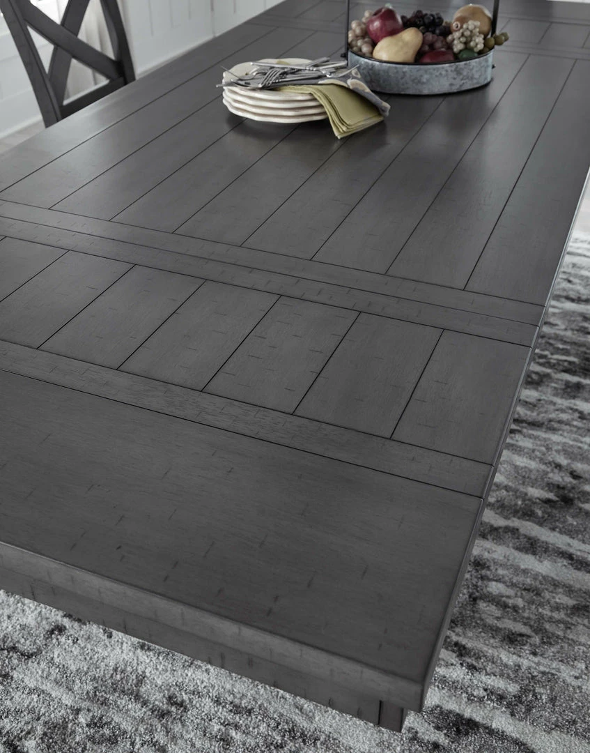 Going gray in the best possible way. This counter height dining table wows with an utterly on-trend smoky gray finish and plank styling. Easy-on extension leaves attach at either end of the table for family dinners or impromptu entertaining. Just a touch of distressing helps it fit right in with your modern farmhouse decor.