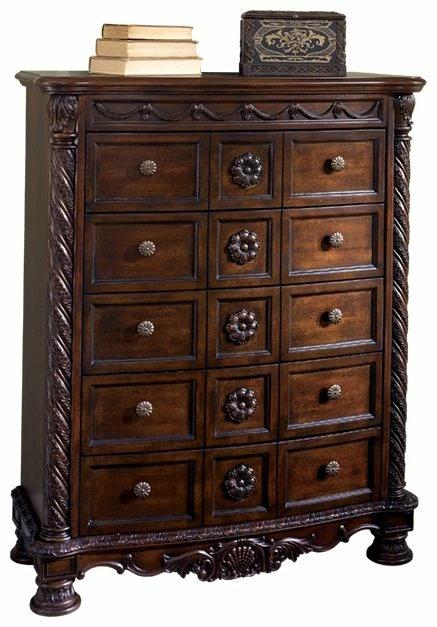 Inspired by the grandeur and grace of Old World traditional style, this chest of drawers is nothing short of stunning. A choice blend of materials is accented by detailed ornamental appliques. Five smooth-gliding drawers make this exceptional piece a wardrobe essential.