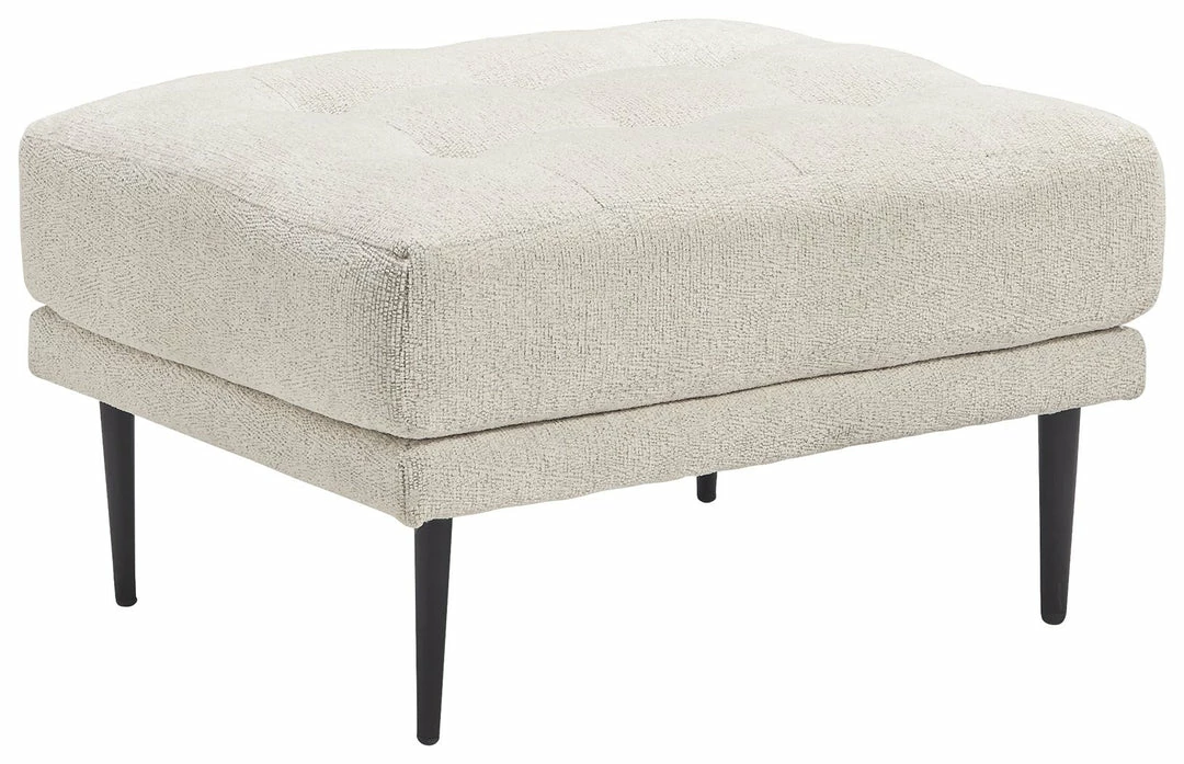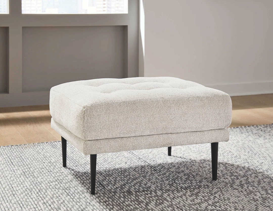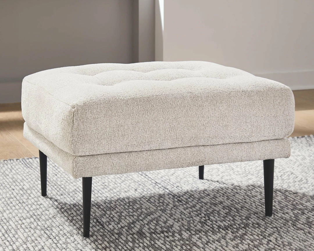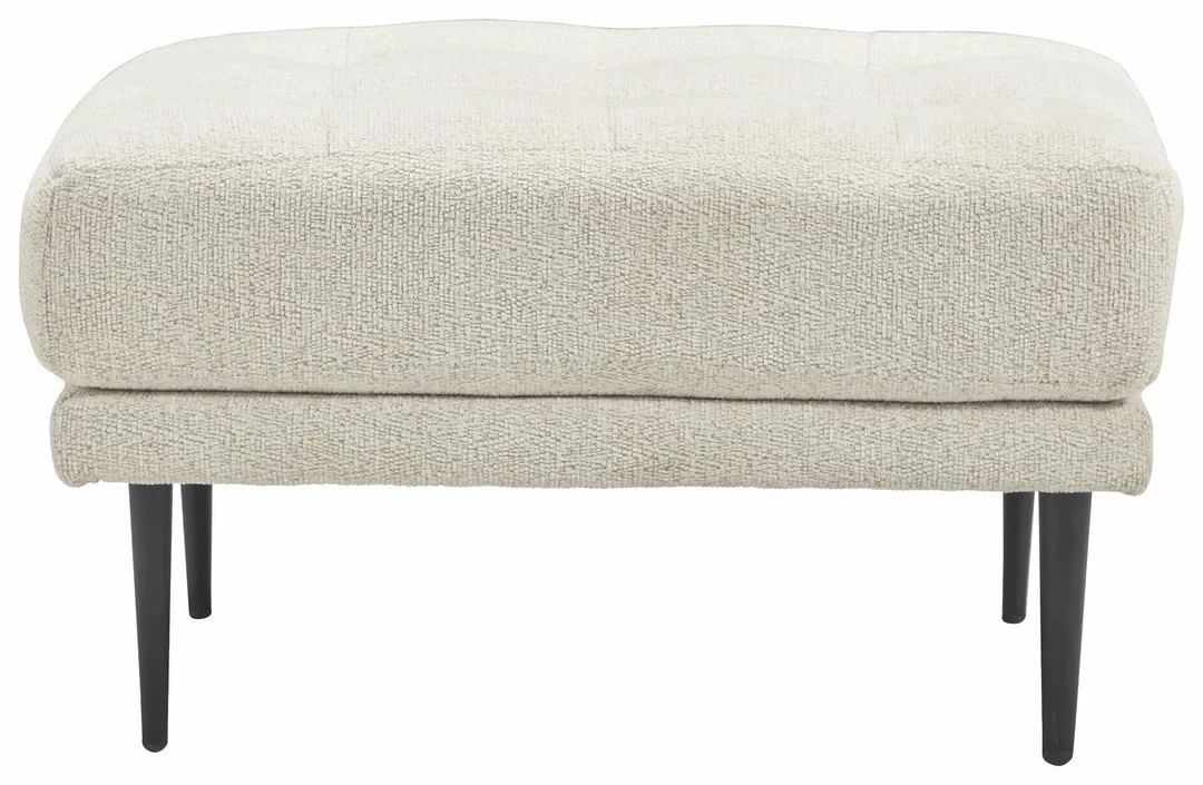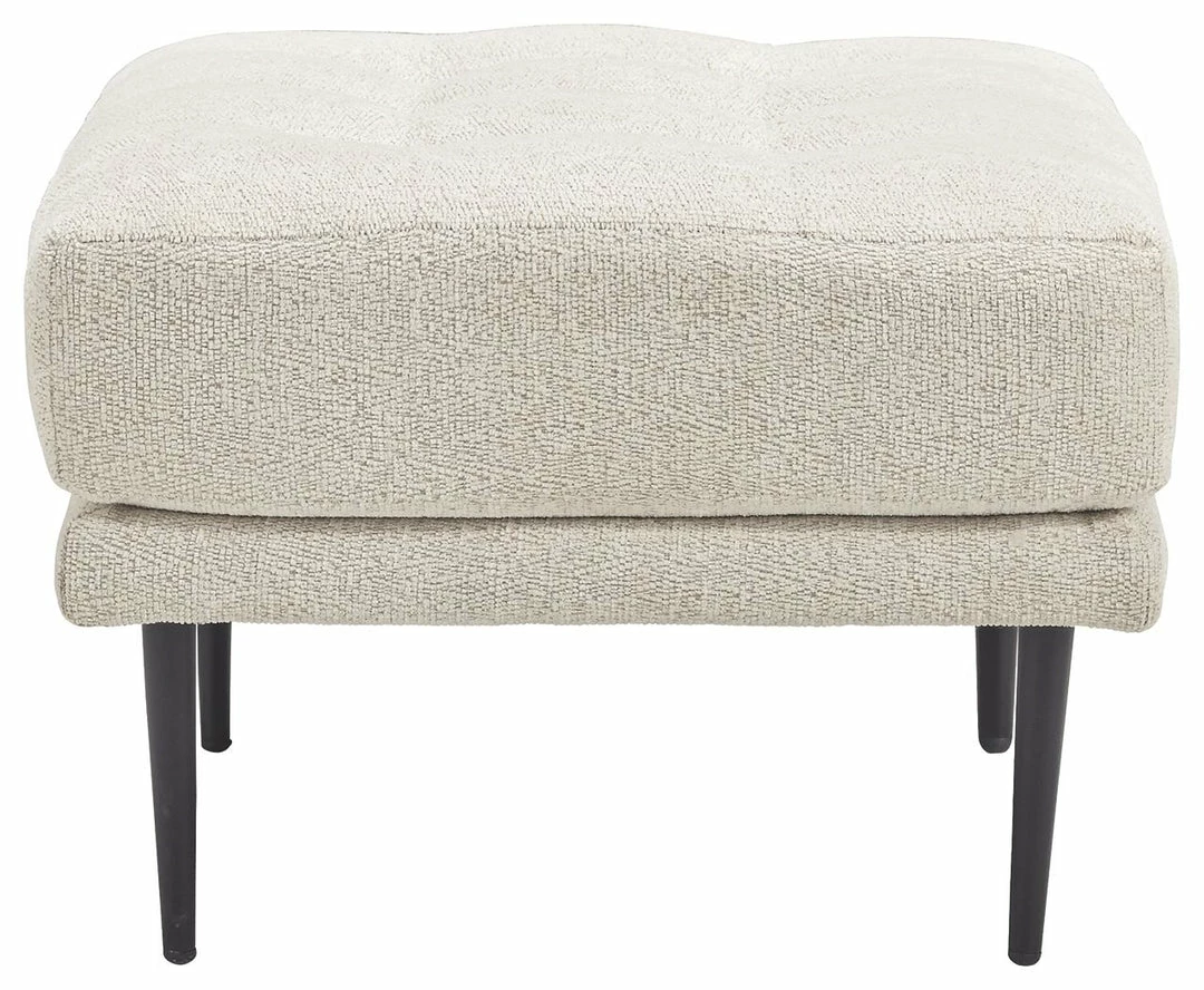 This ottoman combines the clean lines of mid-century style with the cozy softness of your favorite blanket to create your favorite piece of furniture. The textured chenille upholstery evokes a feeling of comfort and security while the faint chevron pattern and exposed black metal legs add sophistication.