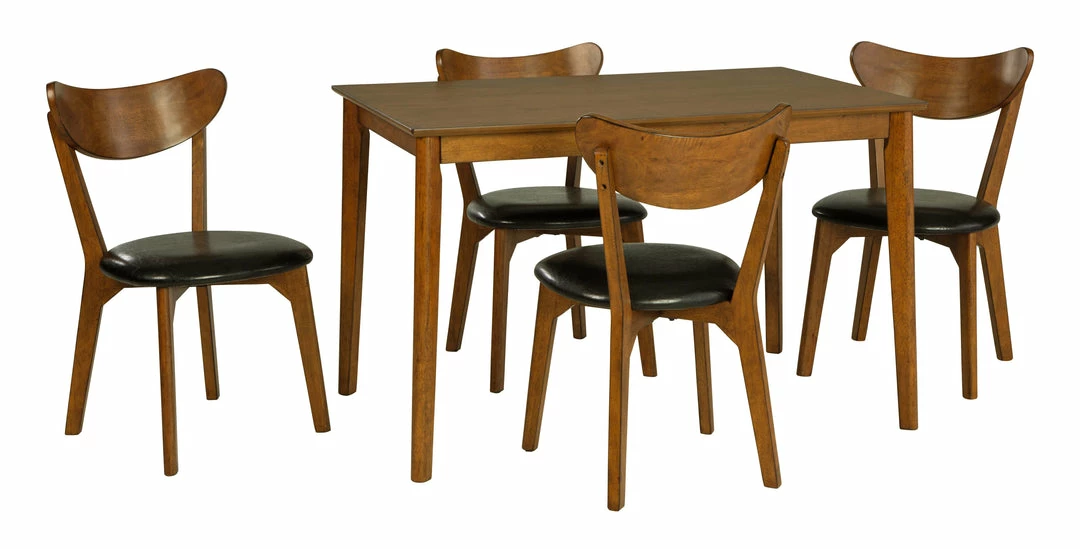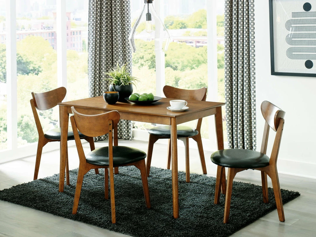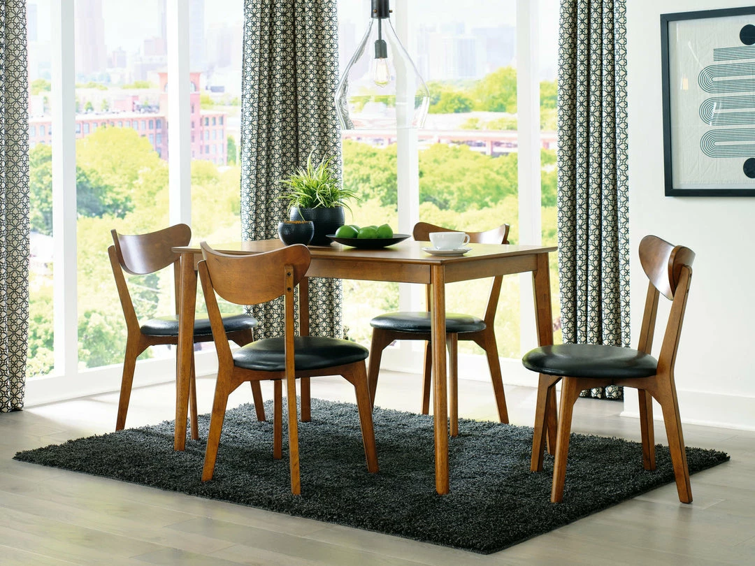 Keeping your home urban cool can be difficult in a small space. This dining table set makes it look easy. A modern contemporary style made for small space living, the set is finished with a light brown cherry color to fit modern decor. The four included chairs sport foam-cushioned seats upholstered with a luxe dark brown faux leather for added cool. Includes adjustable, high-quality levelers attached to the two front chair legs to ensure stability on uneven surfaces. Use them to eliminate wobble and give your family and guests a comfortable, stable and relaxing dining experience. With the table and four chairs arriving in one box, this dining set proves big style comes in small packages.