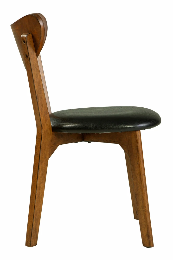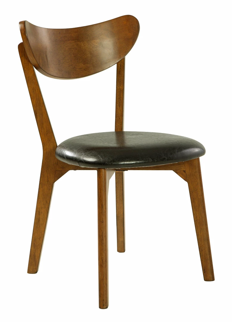 - Chairs with foam-cushioned seat upholstered with dark brown faux leather