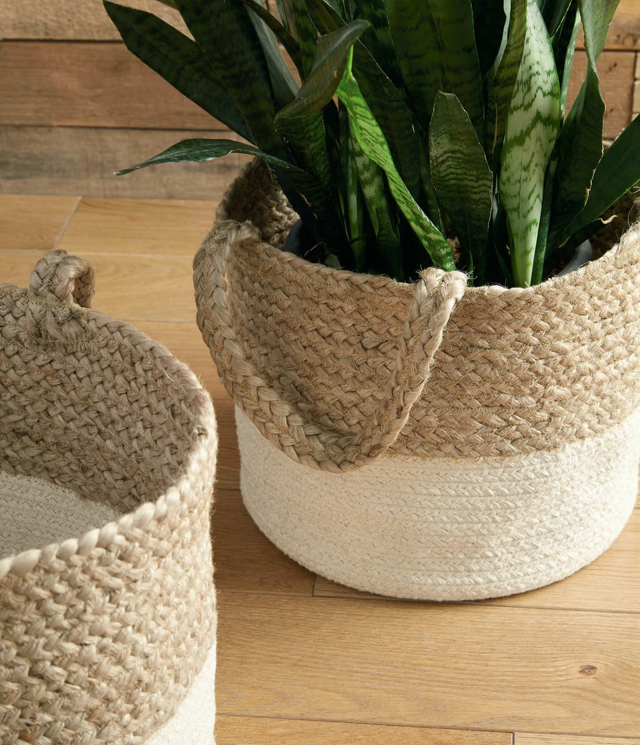 Add a set of storage baskets to your space. This cotton and jute basket set is designed in natural shades of brown and white with handles for easy transport. Full of form and function, these organic storage baskets are simply too pretty to store away.