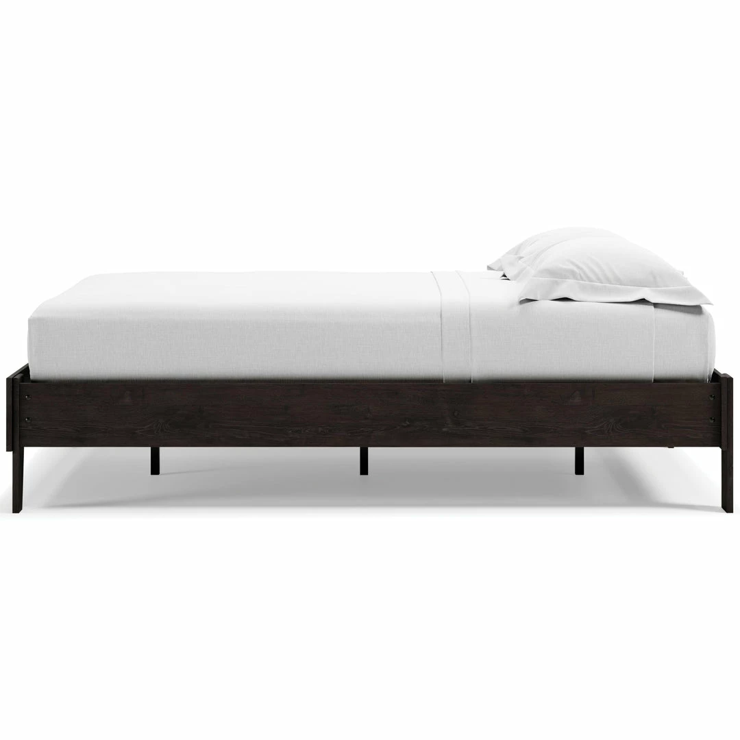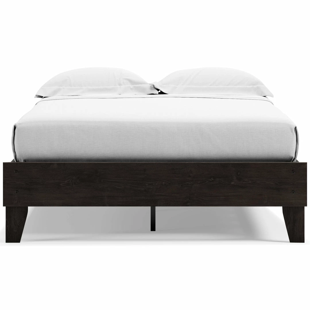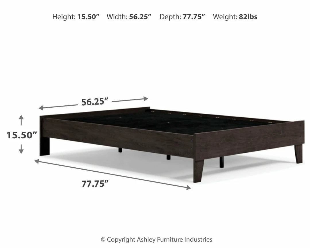 The perfect marriage of simple and contemporary style, this full platform bed is a charming addition to your home. This bed keeps things simple with its dark charcoal finish over replicated oak grain. Best of all, this bed includes a footboard, rails and platformโno additional foundation or box spring needed.