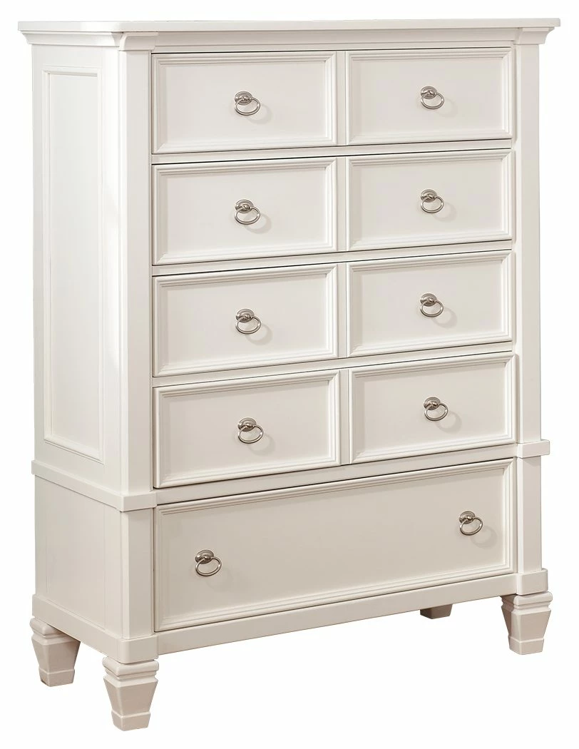 Fresh, crisp and classic. Whether you’re going for shabby chic or cottage quaint, this chest of drawers is dressed to impress. Five drawers help you organize your wardrobe beautifully. Knocker-style hardware in a satin-nickel tone is the perfect finishing touch.