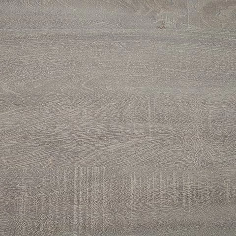- Hand-carved India mango wood tabletop in burnished gray finish
