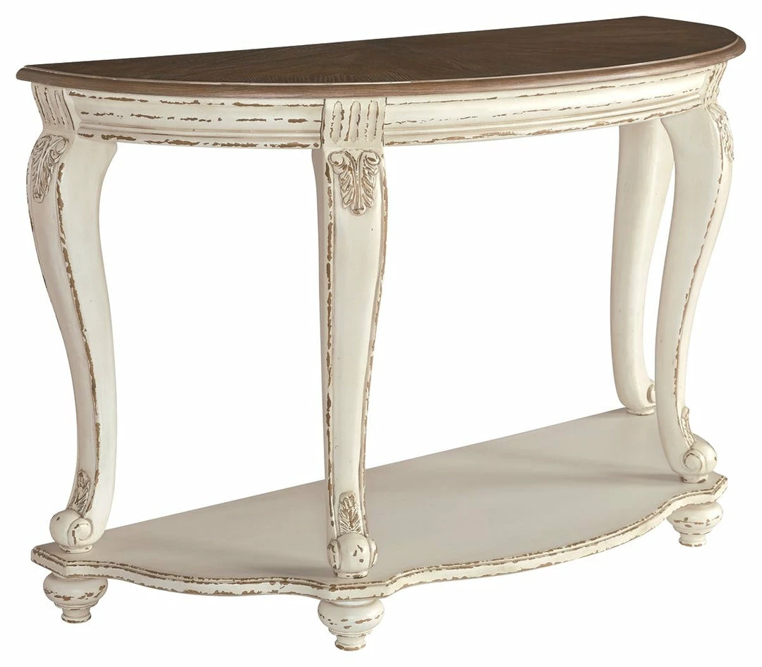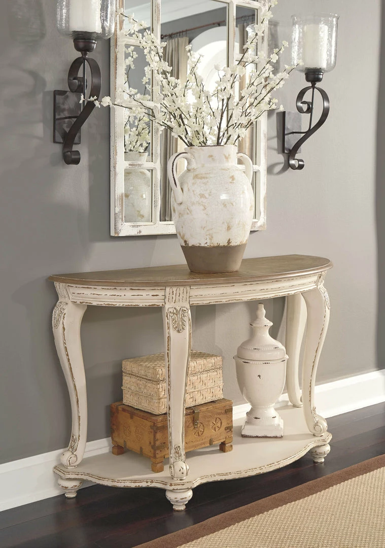 Elevating the art of traditional cottage styling, this demilune sofa table is sure to serve you beautifully for years to come. Antiqued two-tone aesthetic blends a chipped white with a distressed wood finished top for added charm. Classic cabriole legs and shapely lower shelf are a lovely twist. Decorative corbels add refinement.