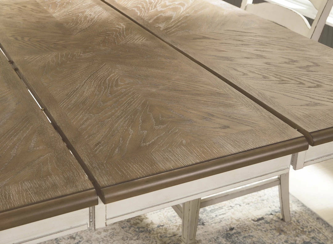 Bon appétit. This counter-height extension table has all the right ingredients for a French country-inspired feast for the eyes. Antiqued two-tone aesthetic pairs a chipped white with a distressed wood finished top for a double serving of charm. Drop-in leaf extends table to a square allowing you to comfortably seat six.