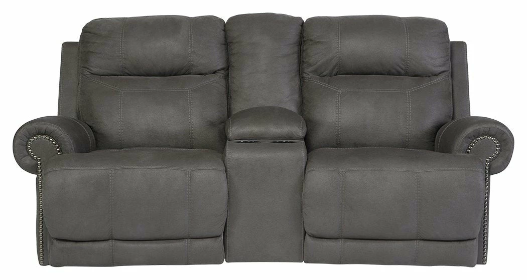 Sparing that “puffy” look you might expect from a recliner, this reclining loveseat with console doesn’t hold back when it comes to contemporary style. Subtle touches such as sporty jumbo stitching, nailhead trim and a “weather worn” effect on the upholstery give this handsome piece a buttoned-up appeal and fresh feel. Center console with dual cup holders brings a handy element to this handsome piece.