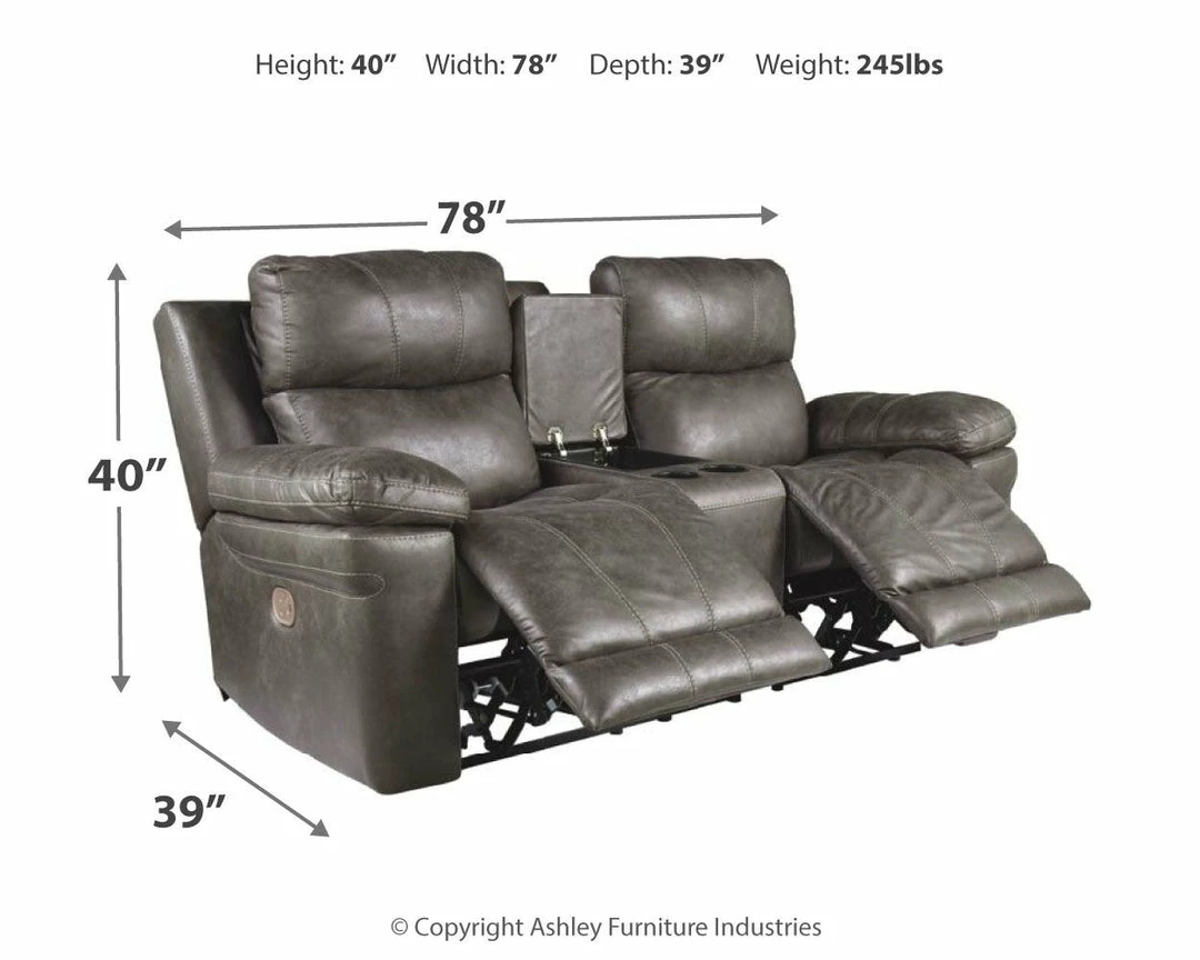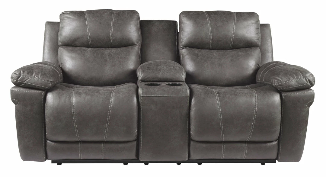 Coming in hot! Discover this power reclining loveseat with center console and two cup holders. Top-of-the-line faux leather fabric gives you the upscale look you want for less. Not to mention it feels incredible. The extended ottomans provide extra lengths for leg comfort. Want to watch TV or read in comfort? Easily fix your view with the power adjustable headrest. Complete with dramatic, jumbo stitching, this piece is out to capture your heart with style and comfort.