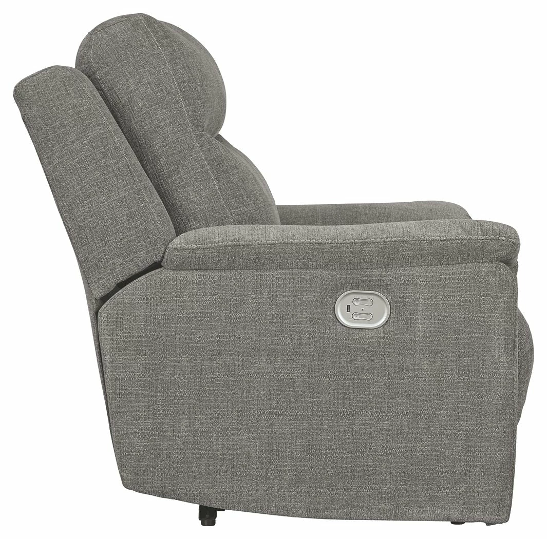 A modern addition to a great room, living room or family room, this power recliner in smoke gray lures with its smokin’ hot way to recline. Unique pad-wrapped armrests provide a cool aesthetic and pillowy softness. Loaded with gorgeous texture, the velvety gray upholstery is sumptuously soft—and made all the more enticing with deep channel tufting for clean-lined flair. With an Easy View™ power adjustable headrest that lets you fully recline and still have a primo view of the TV—plus a USB port in each power control—you truly have it all at your fingertips.