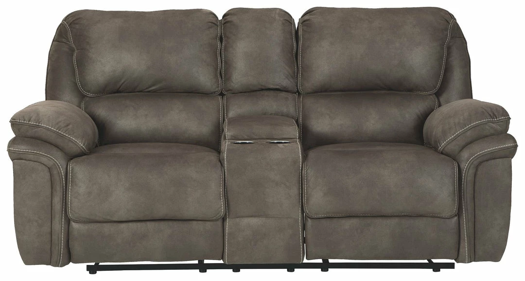 Get the cool leather look you love—and the cozy feel you crave—with this double reclining power loveseat with console in gorgeous graphite. Rest assured, this reclining loveseat’s padded faux leather suede with weathered distressing looks so much like the real thing. Unique design elements include high-contrast jumbo stitching that calls attention to the padded wraparound effect. And talk about pampering. Double padded armrests and back cushioning offer a level of cradling comfort that’s second to none.