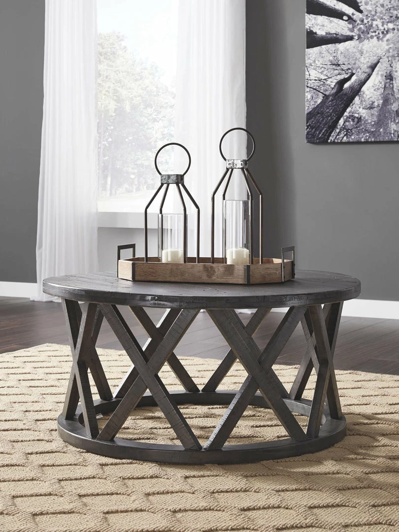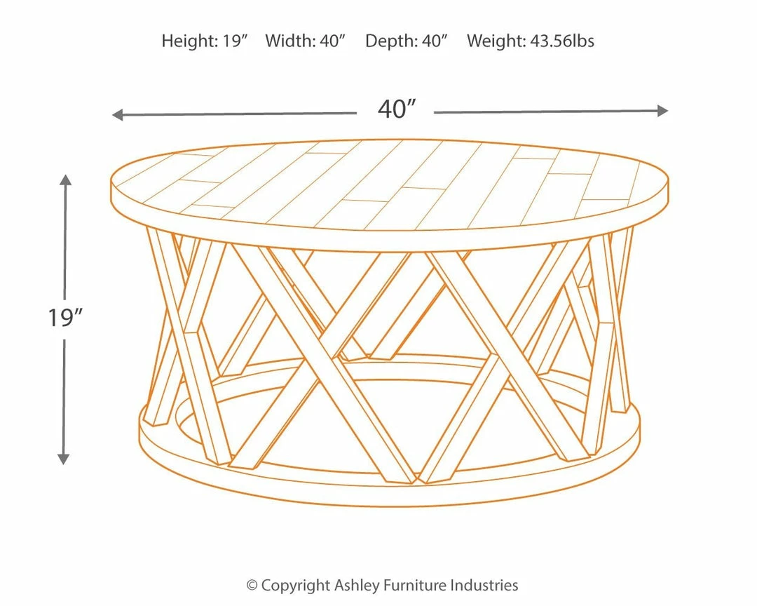 Make it bold and beautiful when you round up the rustic style of this coffee table. You’ll love the casual look that’s delivered through its transitional design. A drum shape with repeated “X” motifs form a unique base and the round top has a planking effect full of detail in a weathered finish. Saw kerf detailing adds notable character to each of the “X” motifs in the table’s baseโwhat a plus for creating a relaxed, rustic setting in your living area.
