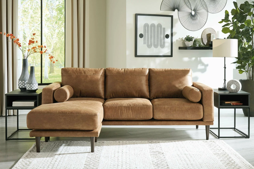 For a fresh spot in your space, turn to this sofa chaise. The invigorating piece breathes warmth into your home with its striking caramel faux leather upholstery, modern bolster pillows and tapered legs. Wind down at the end of a long day and sink into this canyon of comfort.