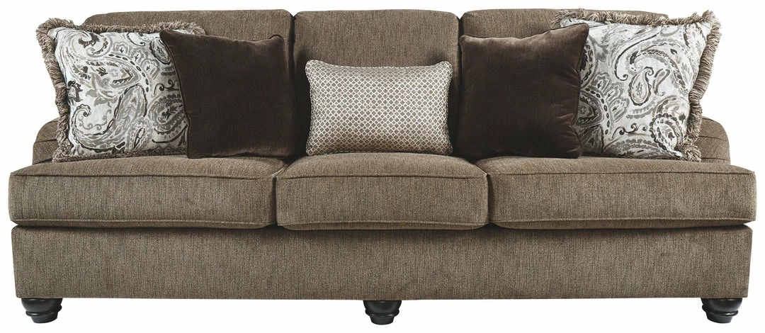 Tell your interior style story with this sophisticated sofa. Traditional Charles of London arms and turned feet are charming touches. Speaking of touch, this sofa is teeming with texture. From the light brown cushions to the fringe-bordered and chocolatey velvet pillows, you’ll revel in its softness. Impressive comfort of the deep, plush cushions is sure to bring you joy.
